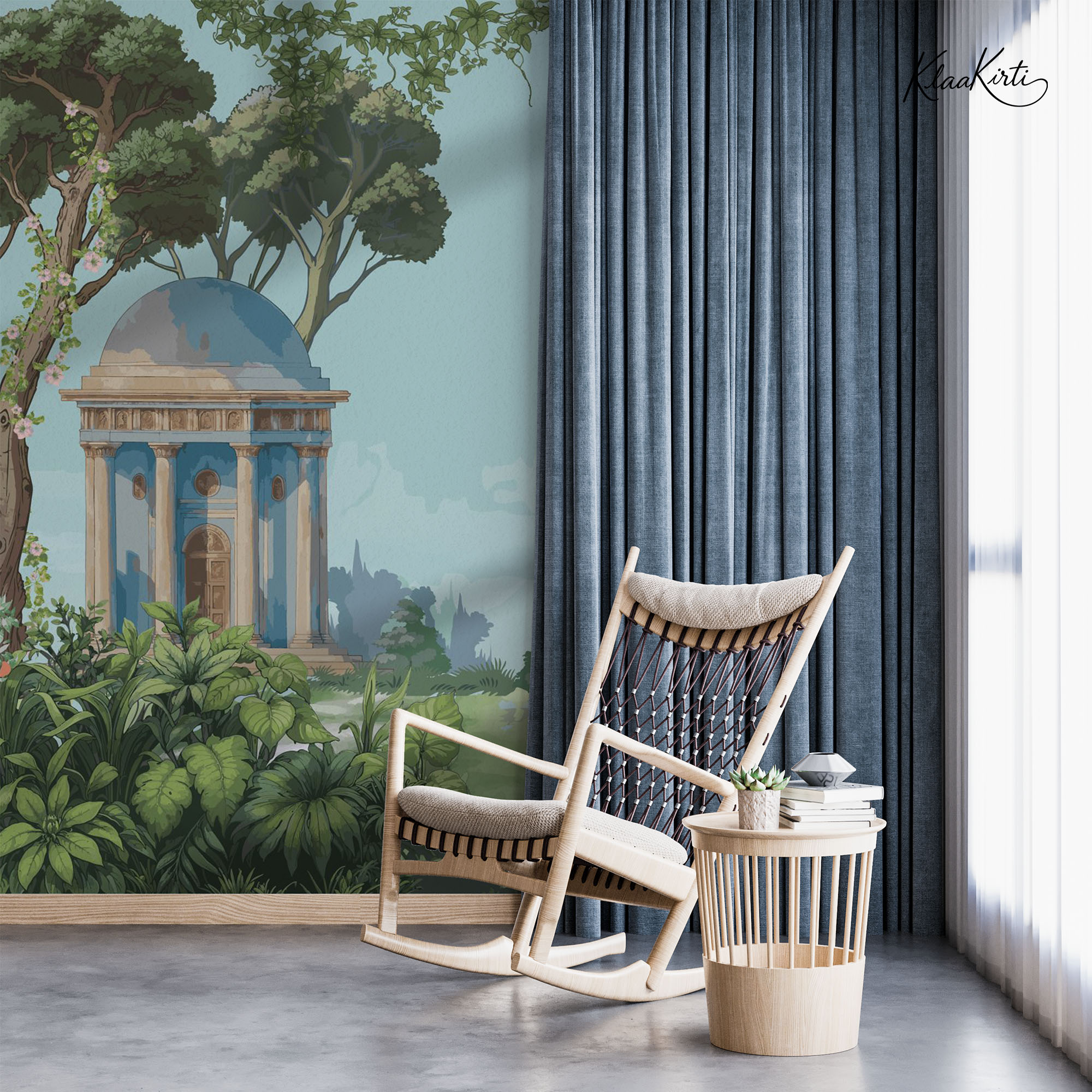Elevate Your Walls with Blue Temple and Garden Premium Wallpaper
