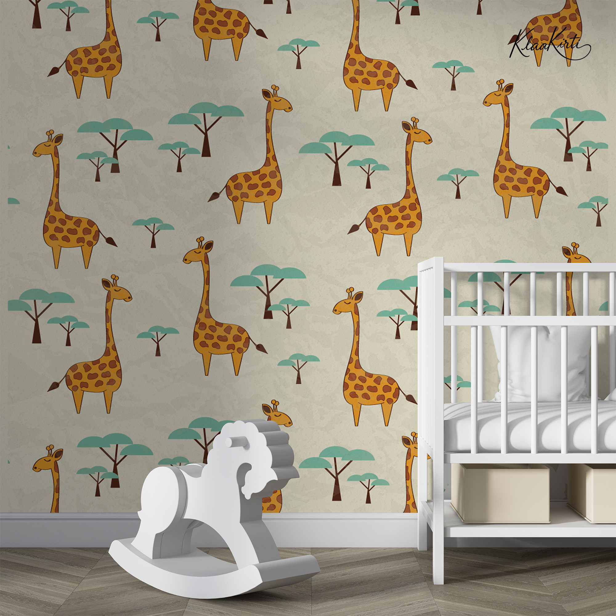 Elevate Your Walls with Cartoon Giraffe and Acacia Tree Kids Premium Wallpaper