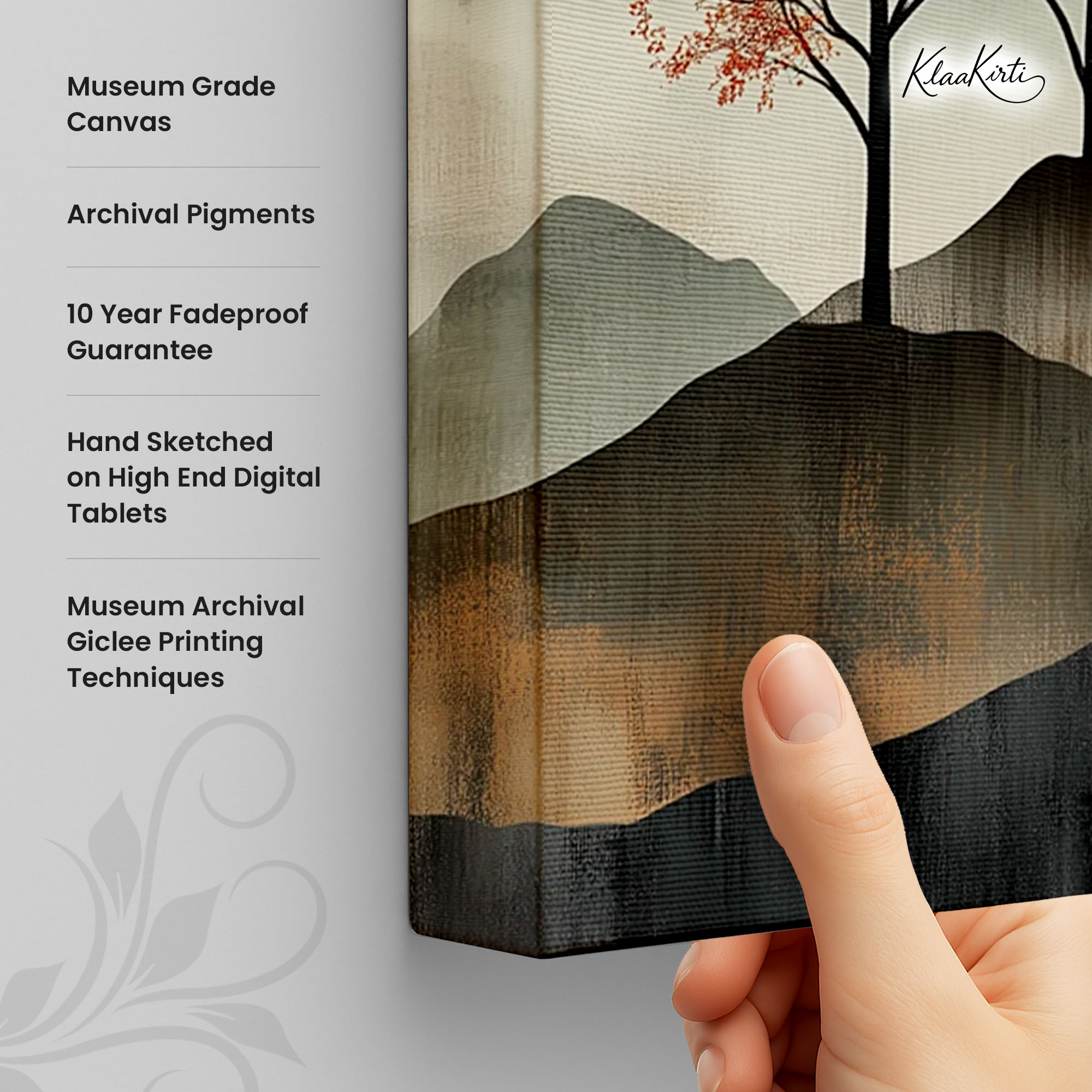 • Regular art prints can vary in quality depending on the materials and printing techniques used. At Klaakirti, our digital canvas prints are created using advanced printing technology and fade-resistant inks on premium, gallery-grade canvas. This ensures sharp detail, rich color, and long-lasting durability — giving you a piece that looks and feels truly premium.