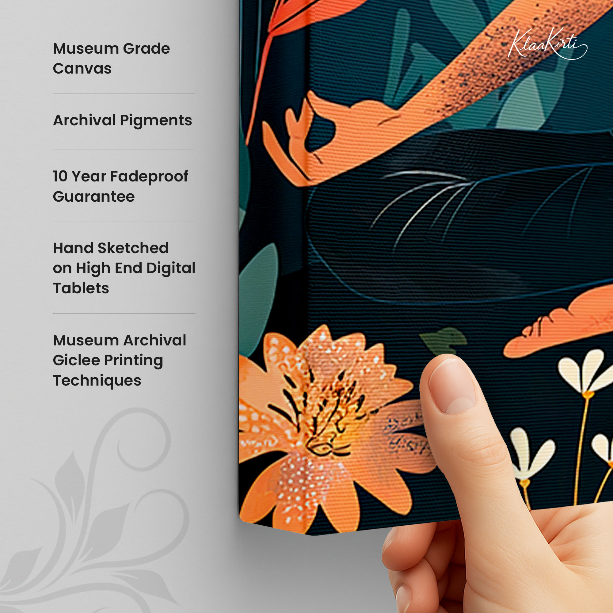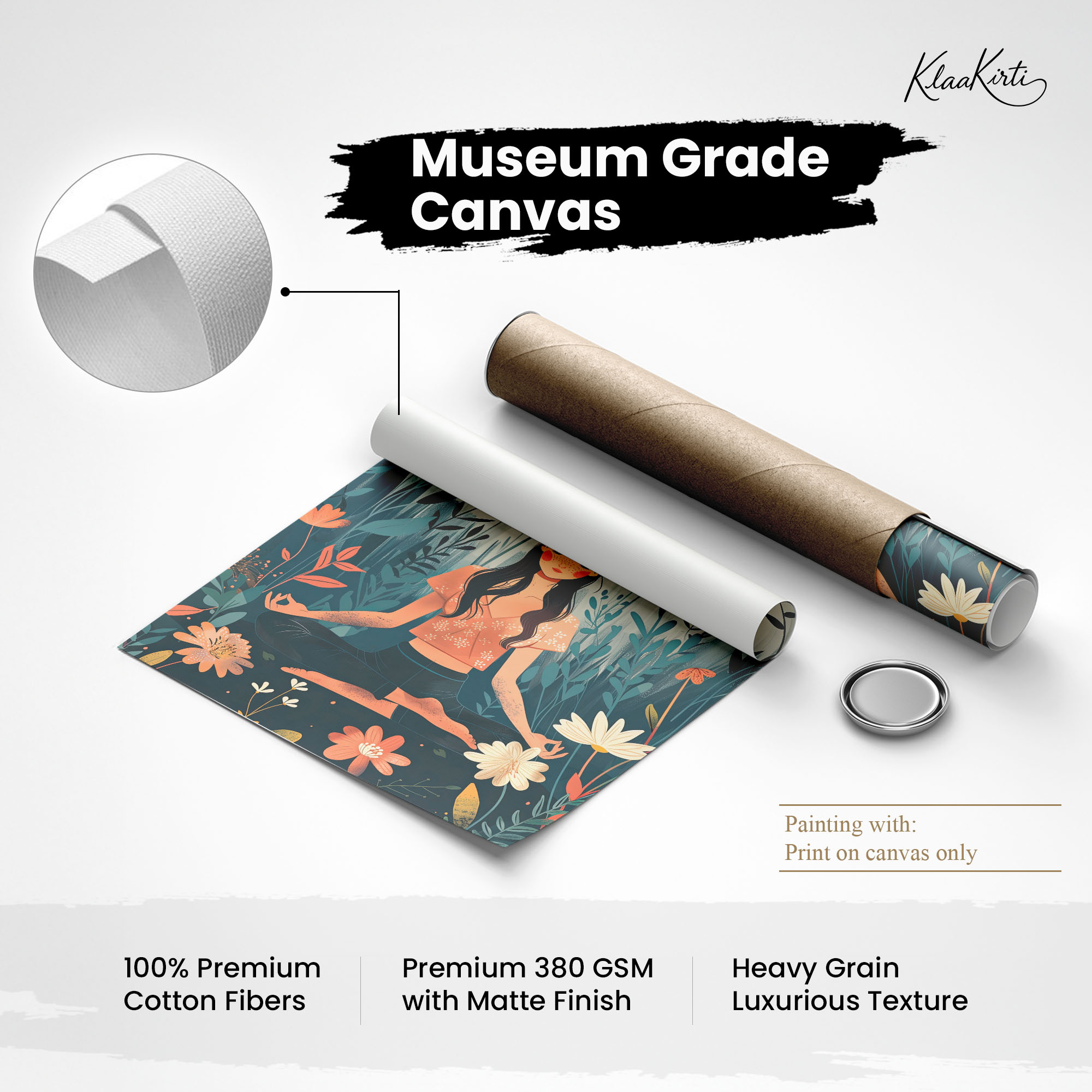 • Regular art prints can vary in quality depending on the materials and printing techniques used. At Klaakirti, our digital canvas prints are created using advanced printing technology and fade-resistant inks on premium, gallery-grade canvas. This ensures sharp detail, rich color, and long-lasting durability — giving you a piece that looks and feels truly premium.