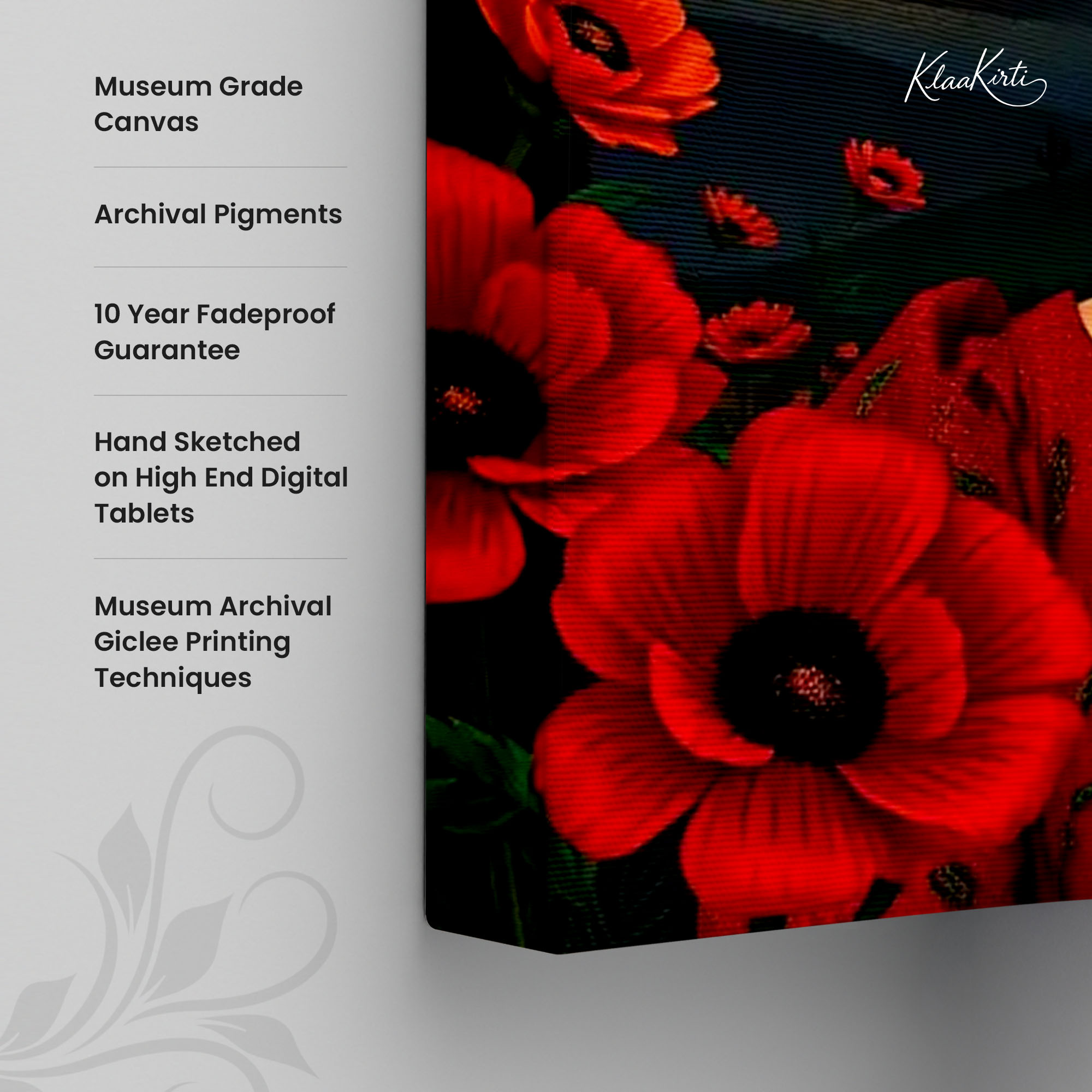 • Regular art prints can vary in quality depending on the materials and printing techniques used. At Klaakirti, our digital canvas prints are created using advanced printing technology and fade-resistant inks on premium, gallery-grade canvas. This ensures sharp detail, rich color, and long-lasting durability — giving you a piece that looks and feels truly premium.