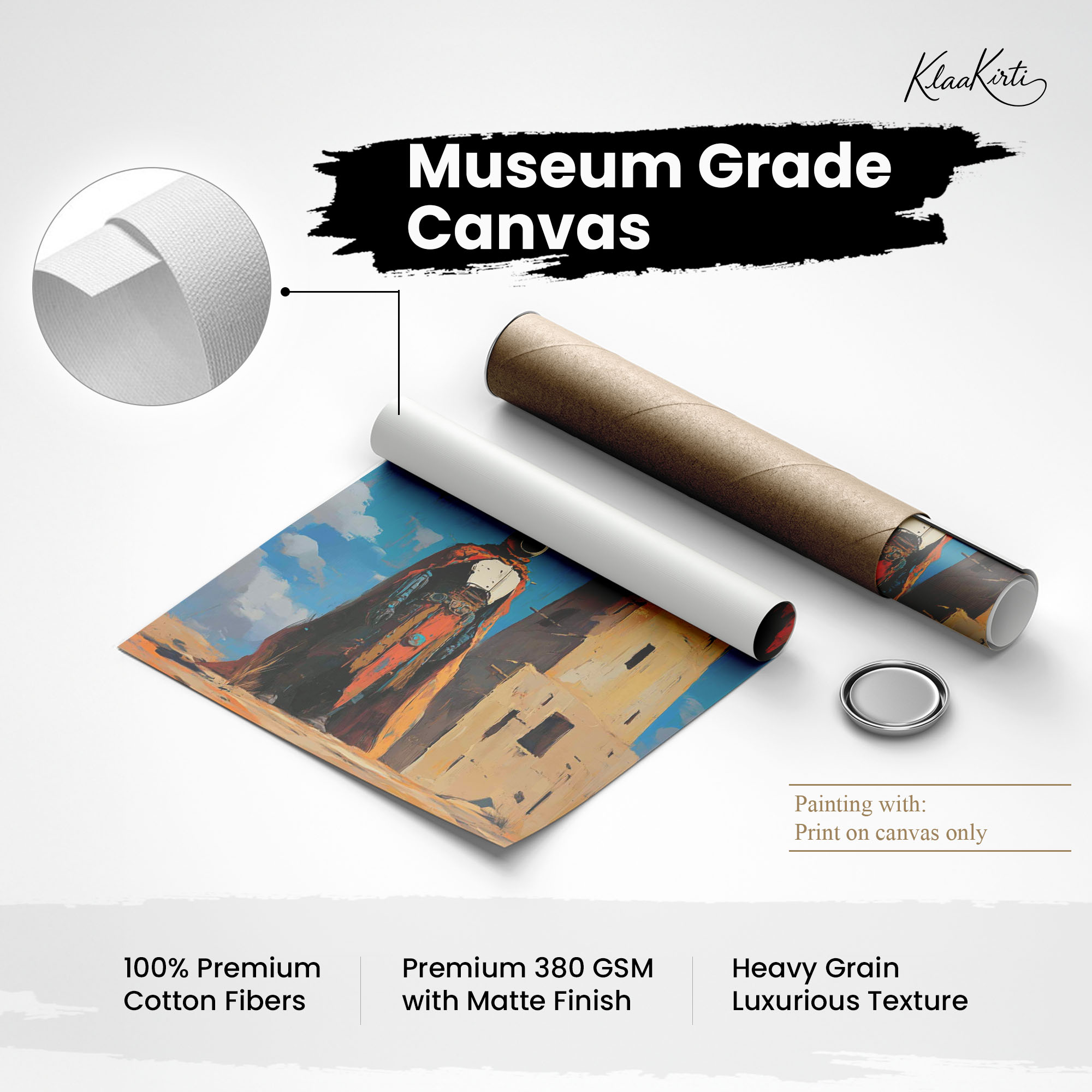 • Regular art prints can vary in quality depending on the materials and printing techniques used. At Klaakirti, our digital canvas prints are created using advanced printing technology and fade-resistant inks on premium, gallery-grade canvas. This ensures sharp detail, rich color, and long-lasting durability — giving you a piece that looks and feels truly premium.