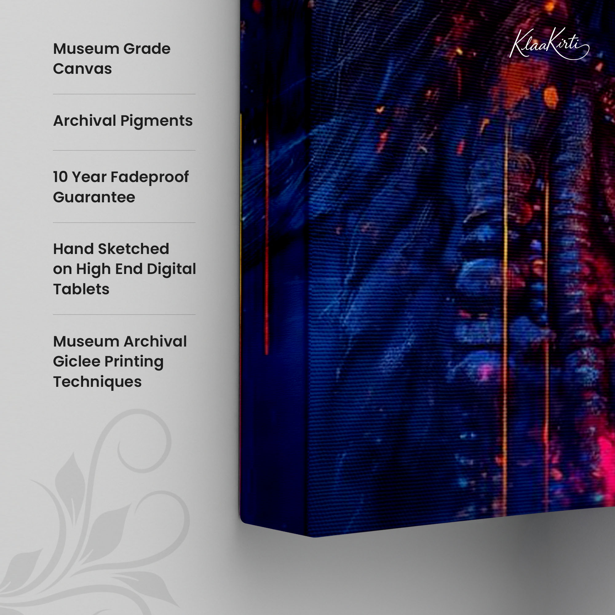 • Regular art prints can vary in quality depending on the materials and printing techniques used. At Klaakirti, our digital canvas prints are created using advanced printing technology and fade-resistant inks on premium, gallery-grade canvas. This ensures sharp detail, rich color, and long-lasting durability — giving you a piece that looks and feels truly premium.