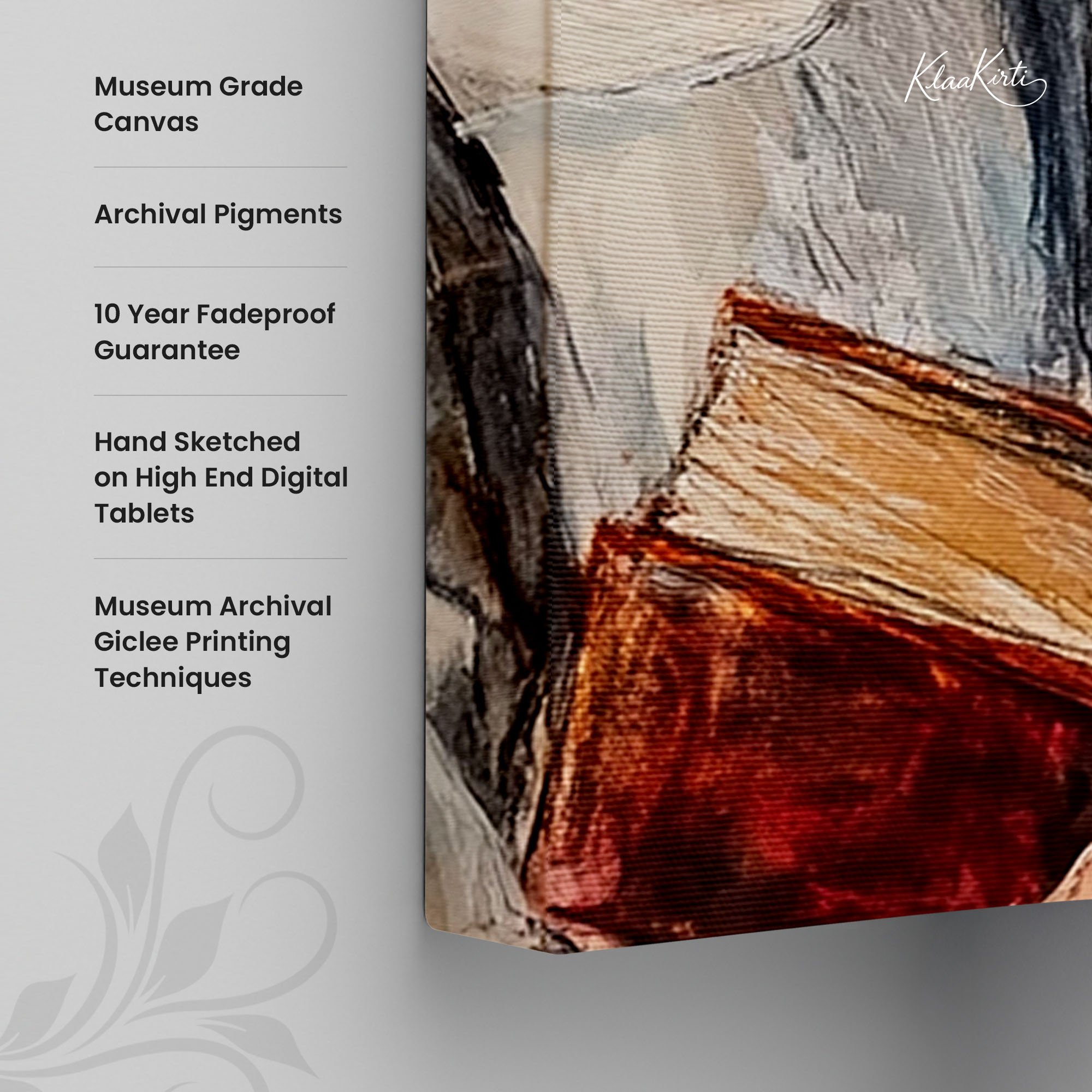 • Regular art prints can vary in quality depending on the materials and printing techniques used. At Klaakirti, our digital canvas prints are created using advanced printing technology and fade-resistant inks on premium, gallery-grade canvas. This ensures sharp detail, rich color, and long-lasting durability — giving you a piece that looks and feels truly premium.
