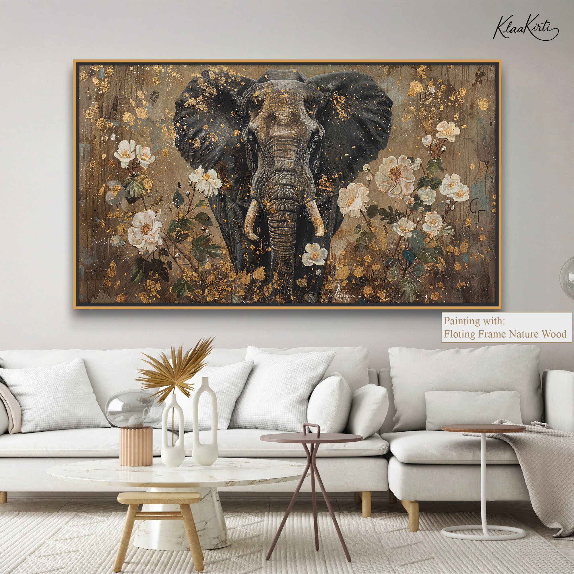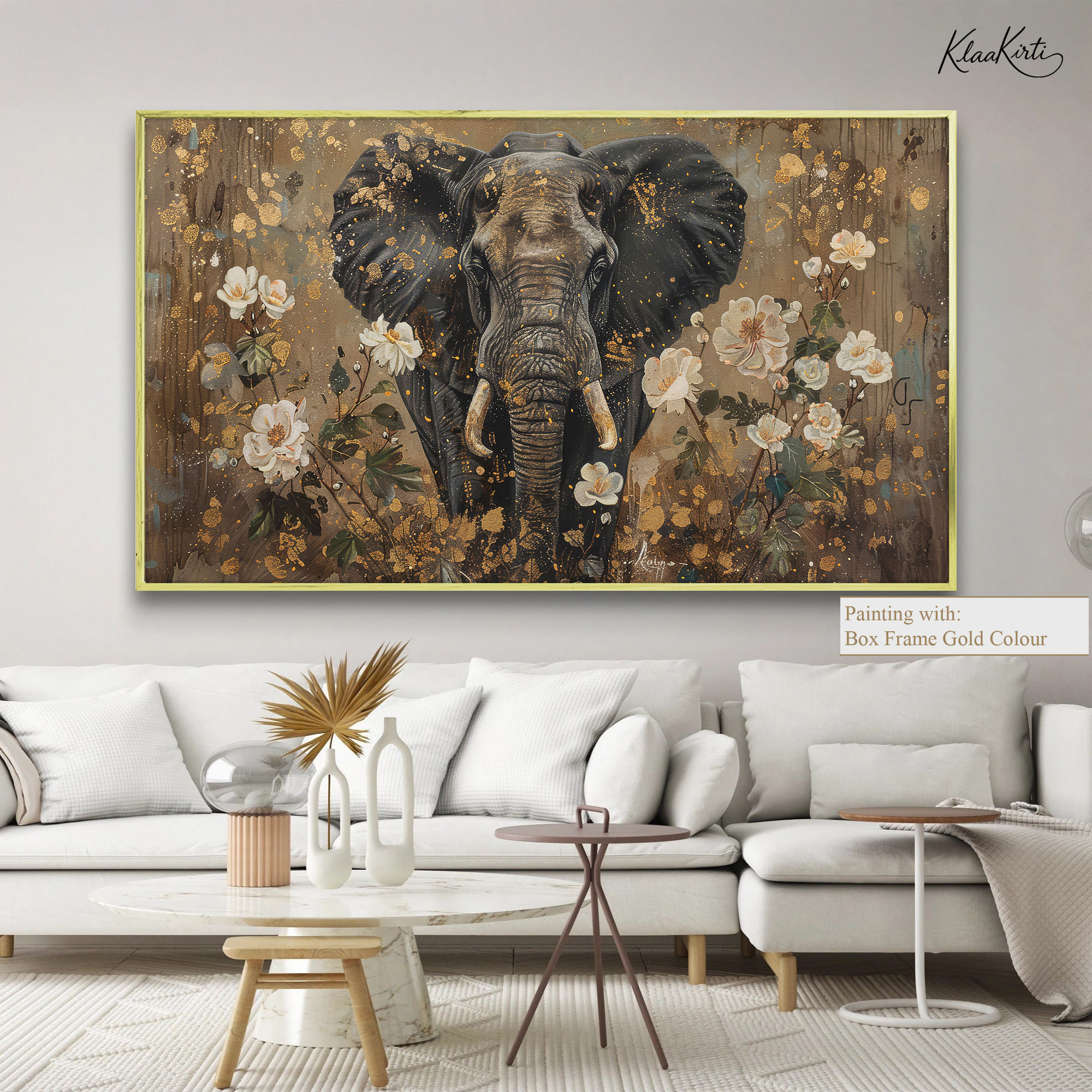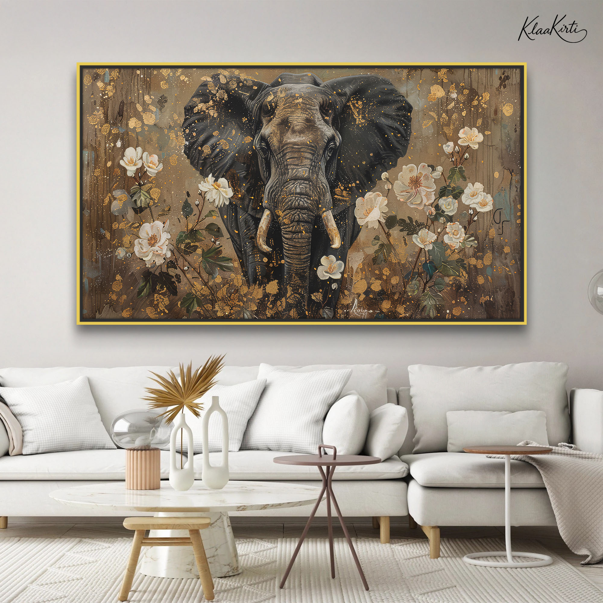 Elephant in Golden Floral Splendor Canvas Wall Art for Modern Interiors.