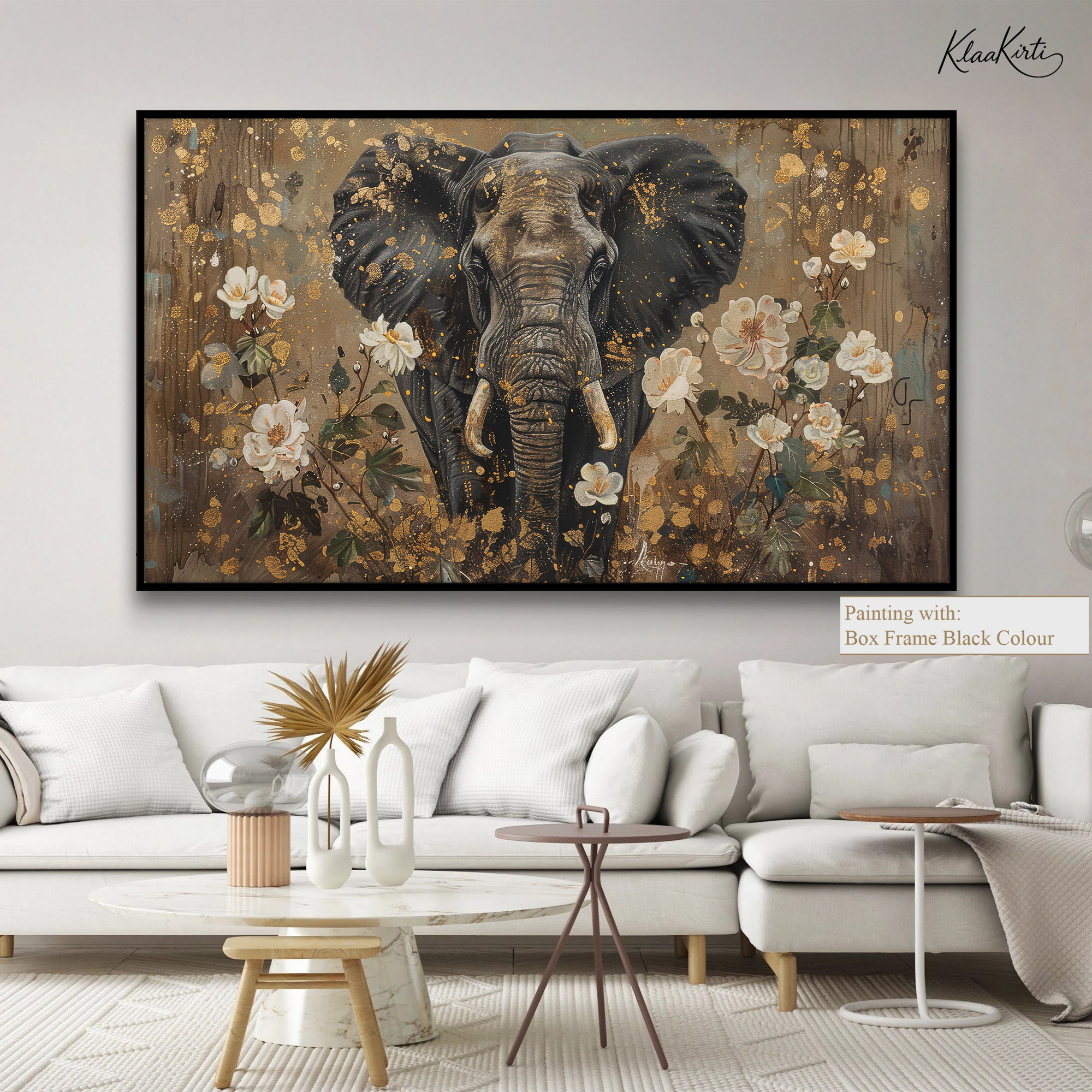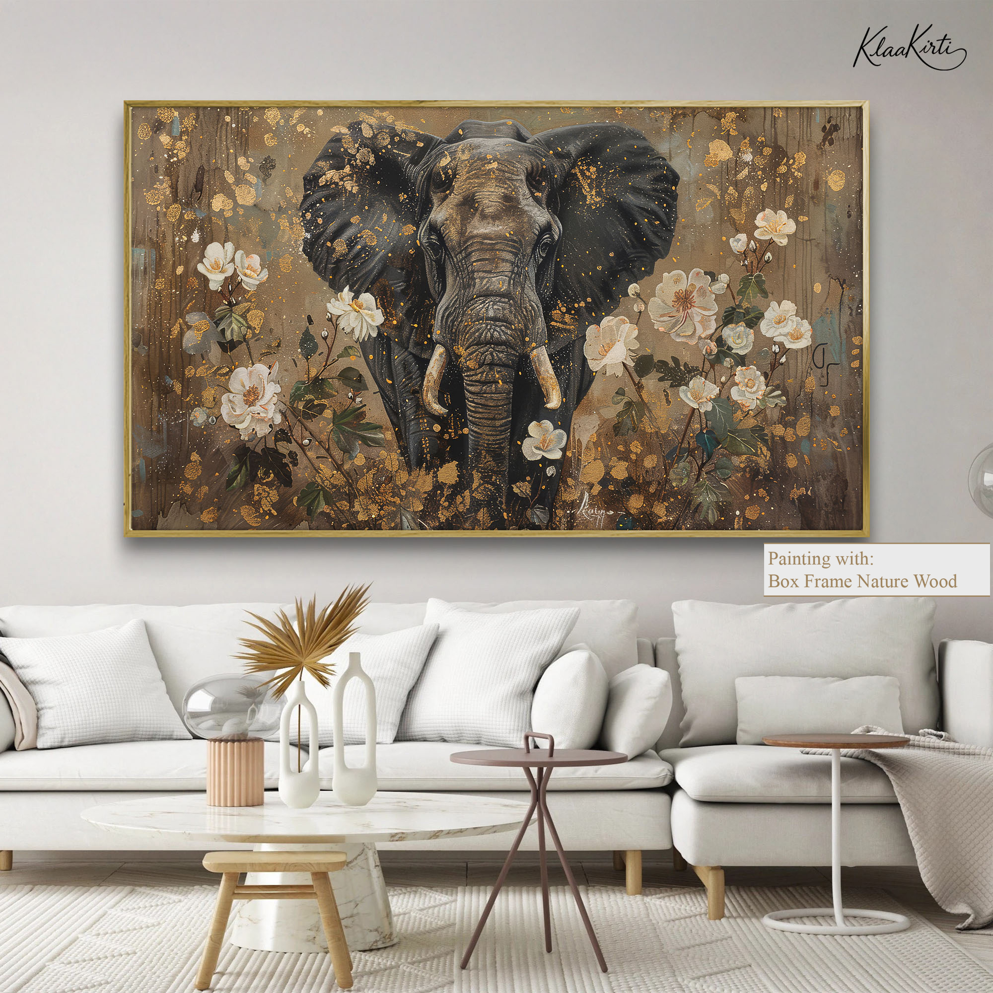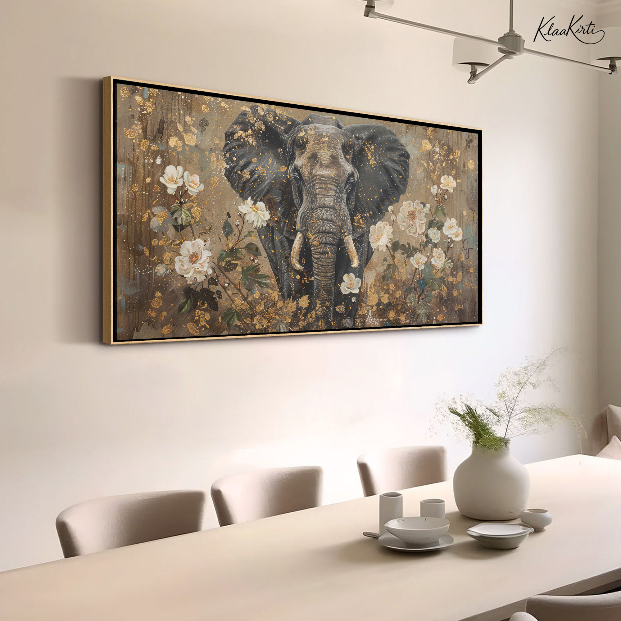 Elephant in Golden Floral Splendor Canvas Wall Art for Modern Interiors.