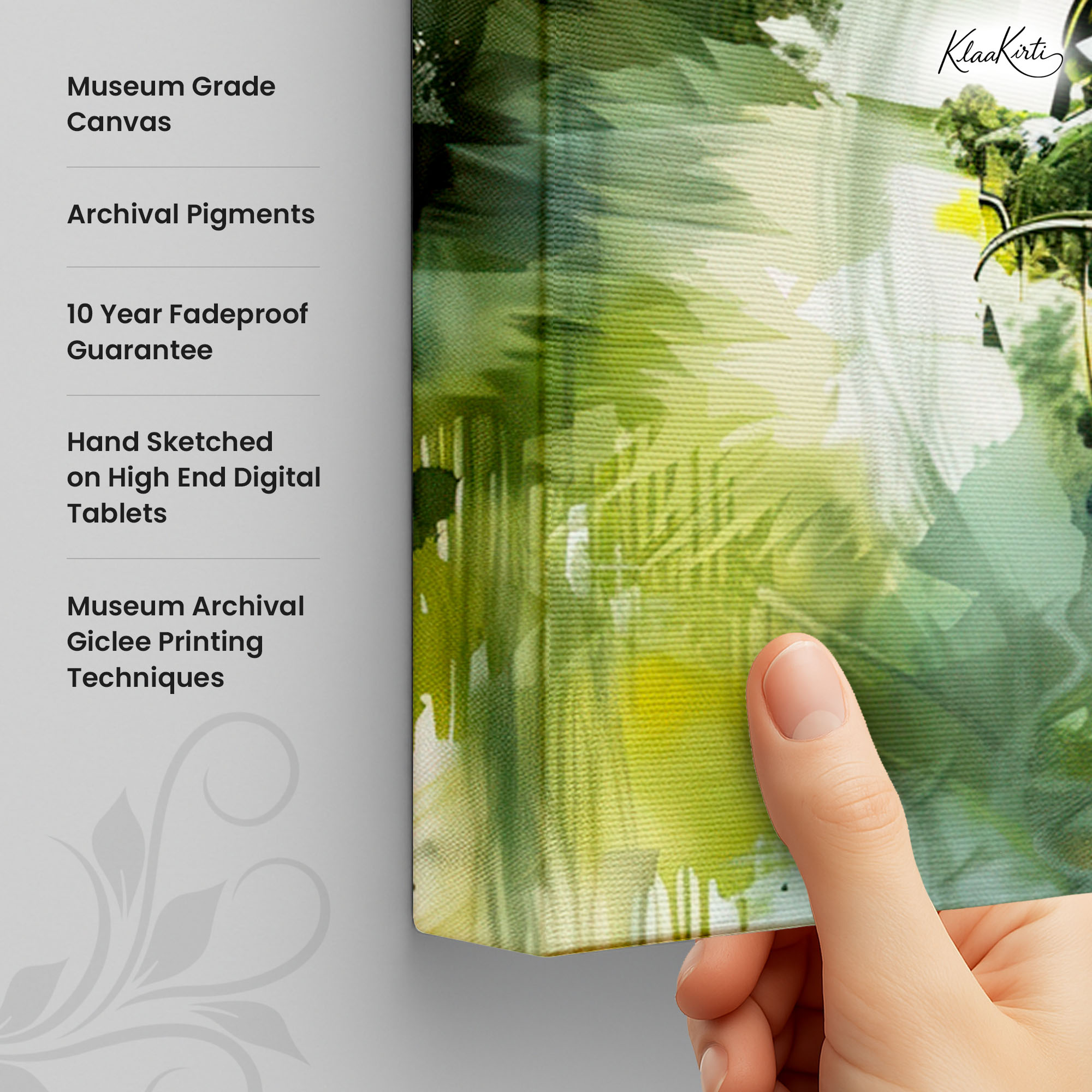• Regular art prints can vary in quality depending on the materials and printing techniques used. At Klaakirti, our digital canvas prints are created using advanced printing technology and fade-resistant inks on premium, gallery-grade canvas. This ensures sharp detail, rich color, and long-lasting durability — giving you a piece that looks and feels truly premium.