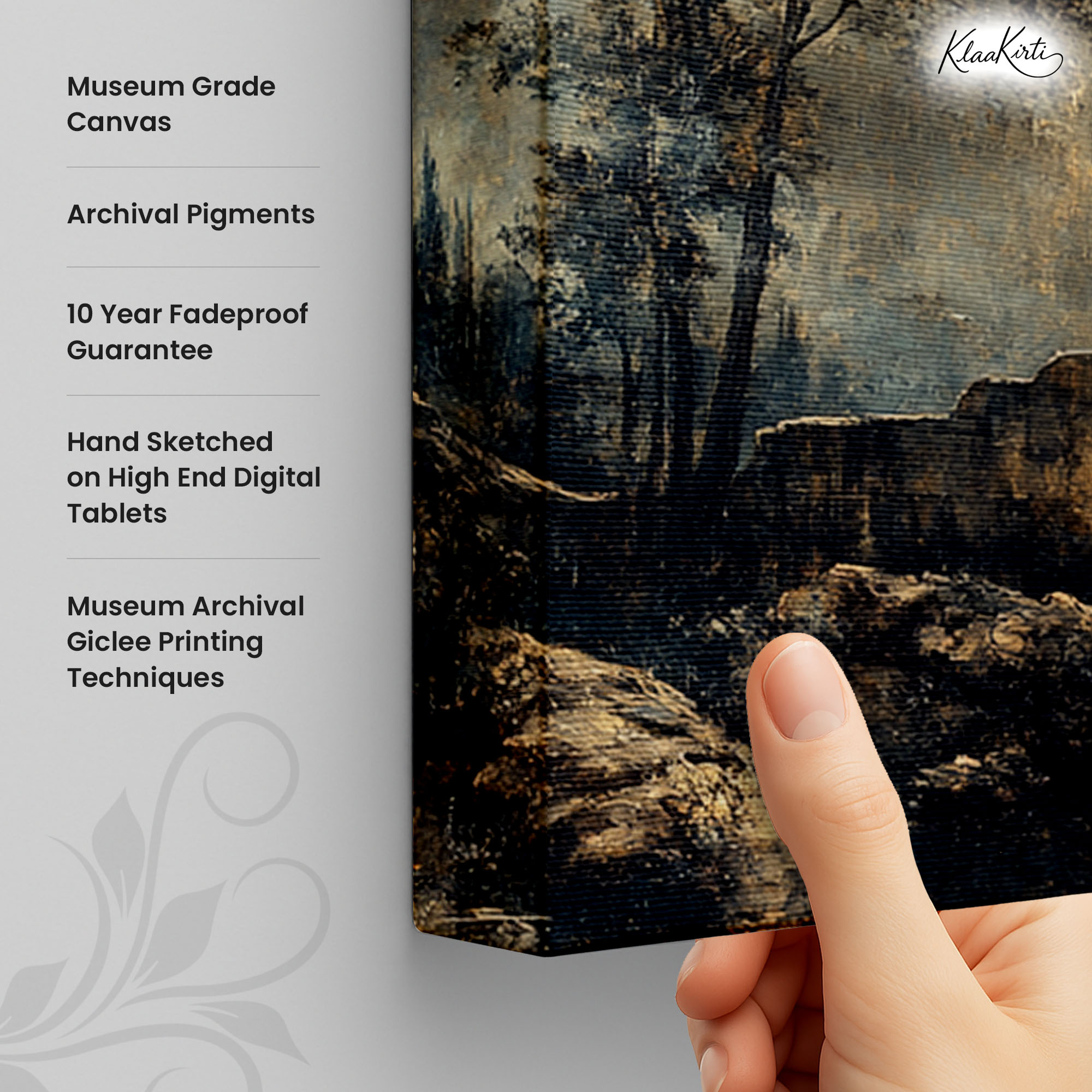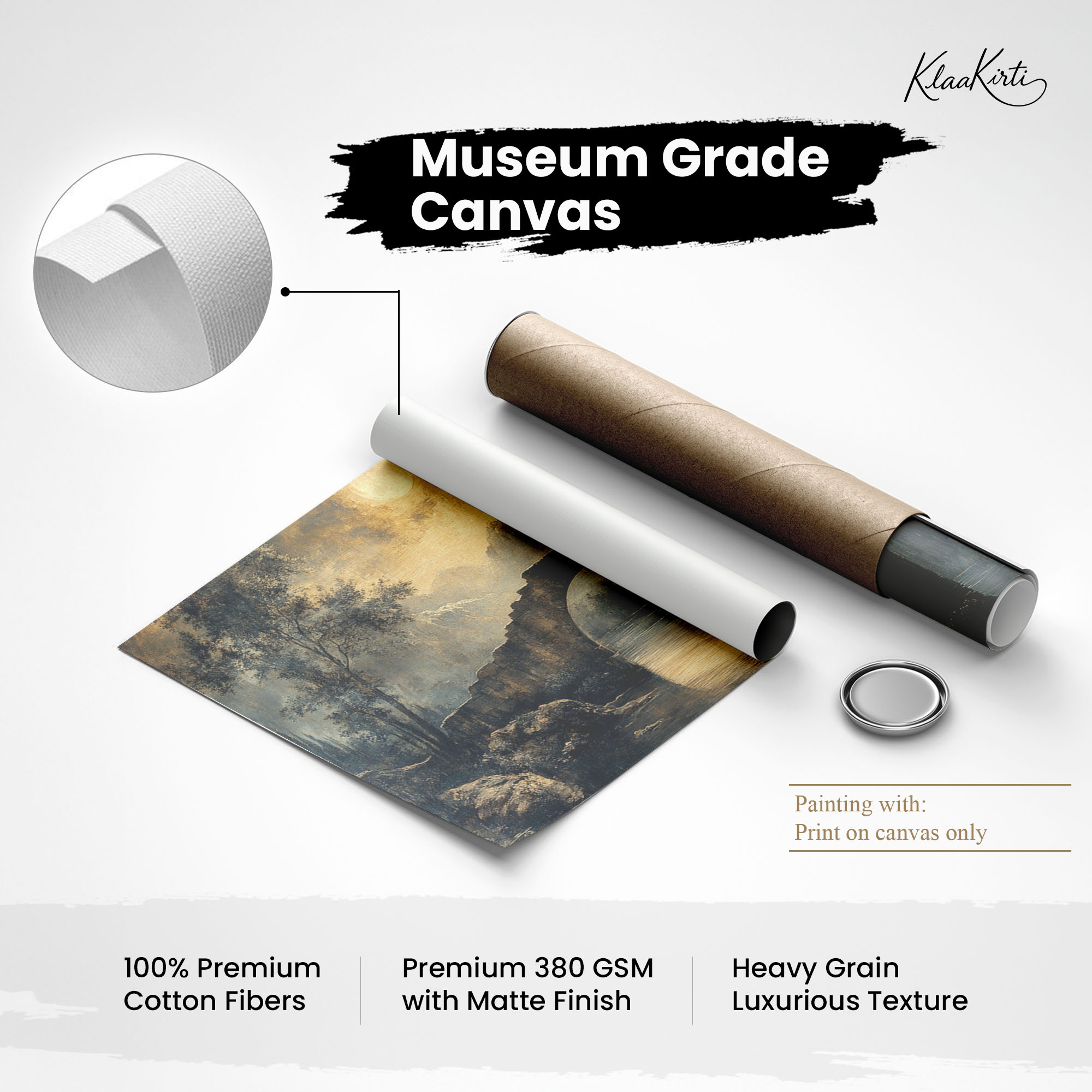 • Regular art prints can vary in quality depending on the materials and printing techniques used. At Klaakirti, our digital canvas prints are created using advanced printing technology and fade-resistant inks on premium, gallery-grade canvas. This ensures sharp detail, rich color, and long-lasting durability — giving you a piece that looks and feels truly premium.