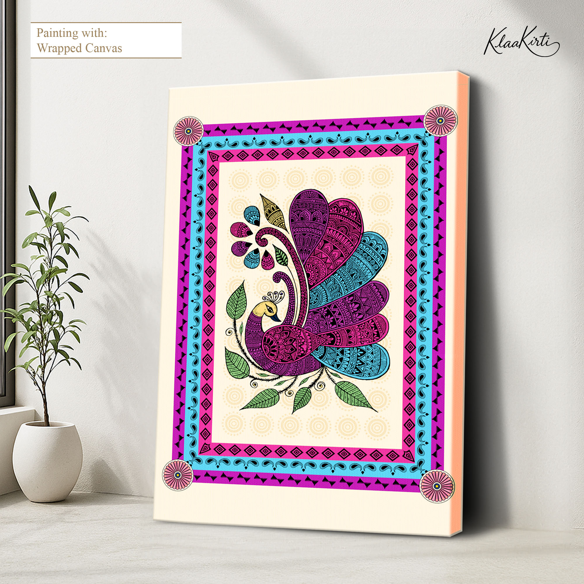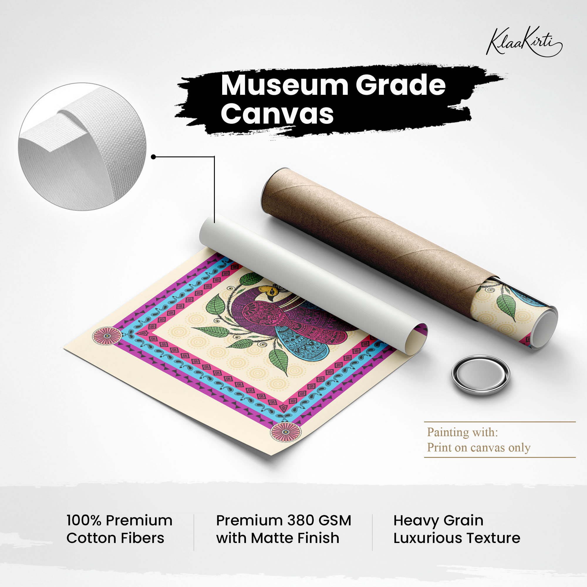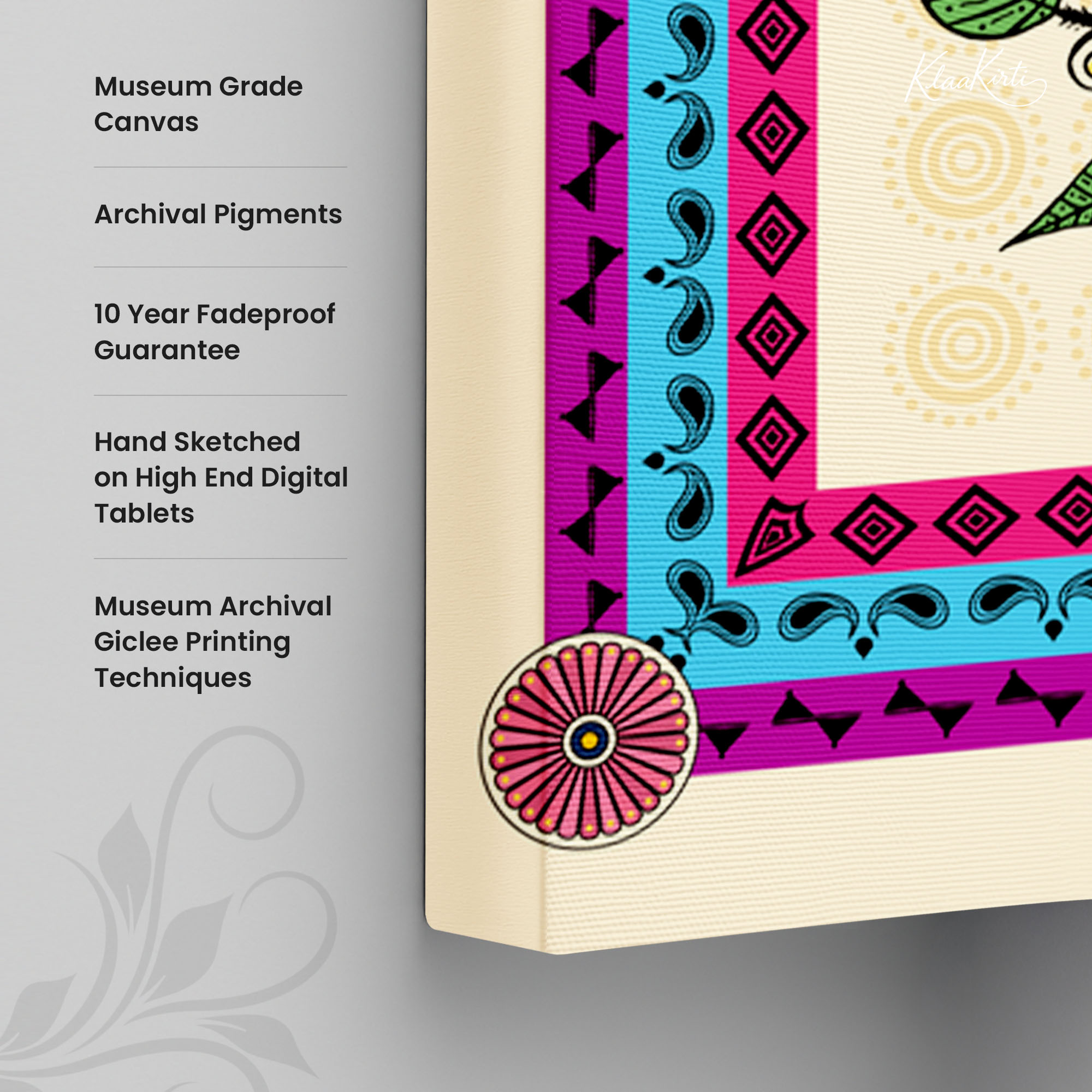 • Regular art prints can vary in quality depending on the materials and printing techniques used. At Klaakirti, our digital canvas prints are created using advanced printing technology and fade-resistant inks on premium, gallery-grade canvas. This ensures sharp detail, rich color, and long-lasting durability — giving you a piece that looks and feels truly premium.