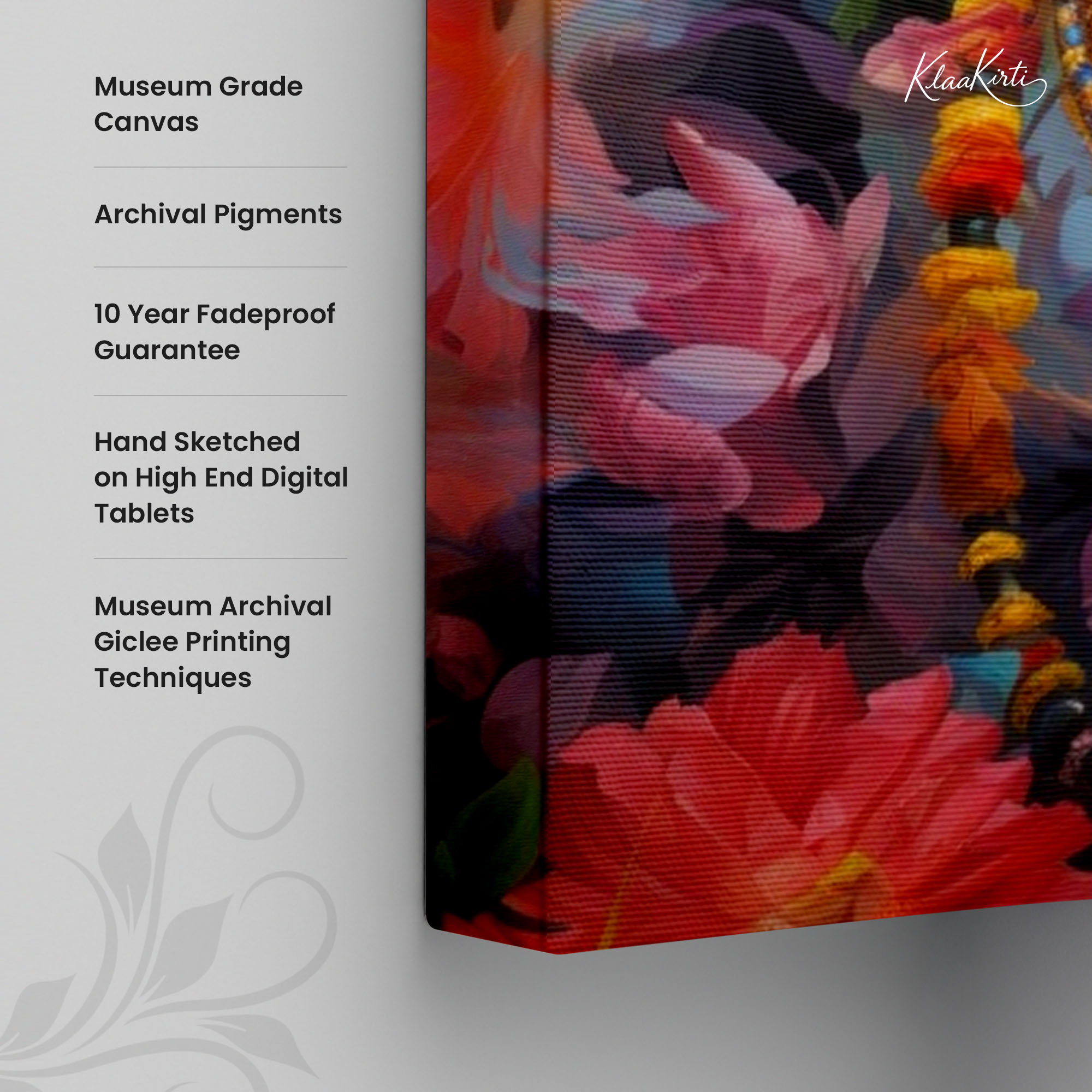 • Regular art prints can vary in quality depending on the materials and printing techniques used. At Klaakirti, our digital canvas prints are created using advanced printing technology and fade-resistant inks on premium, gallery-grade canvas. This ensures sharp detail, rich color, and long-lasting durability — giving you a piece that looks and feels truly premium.