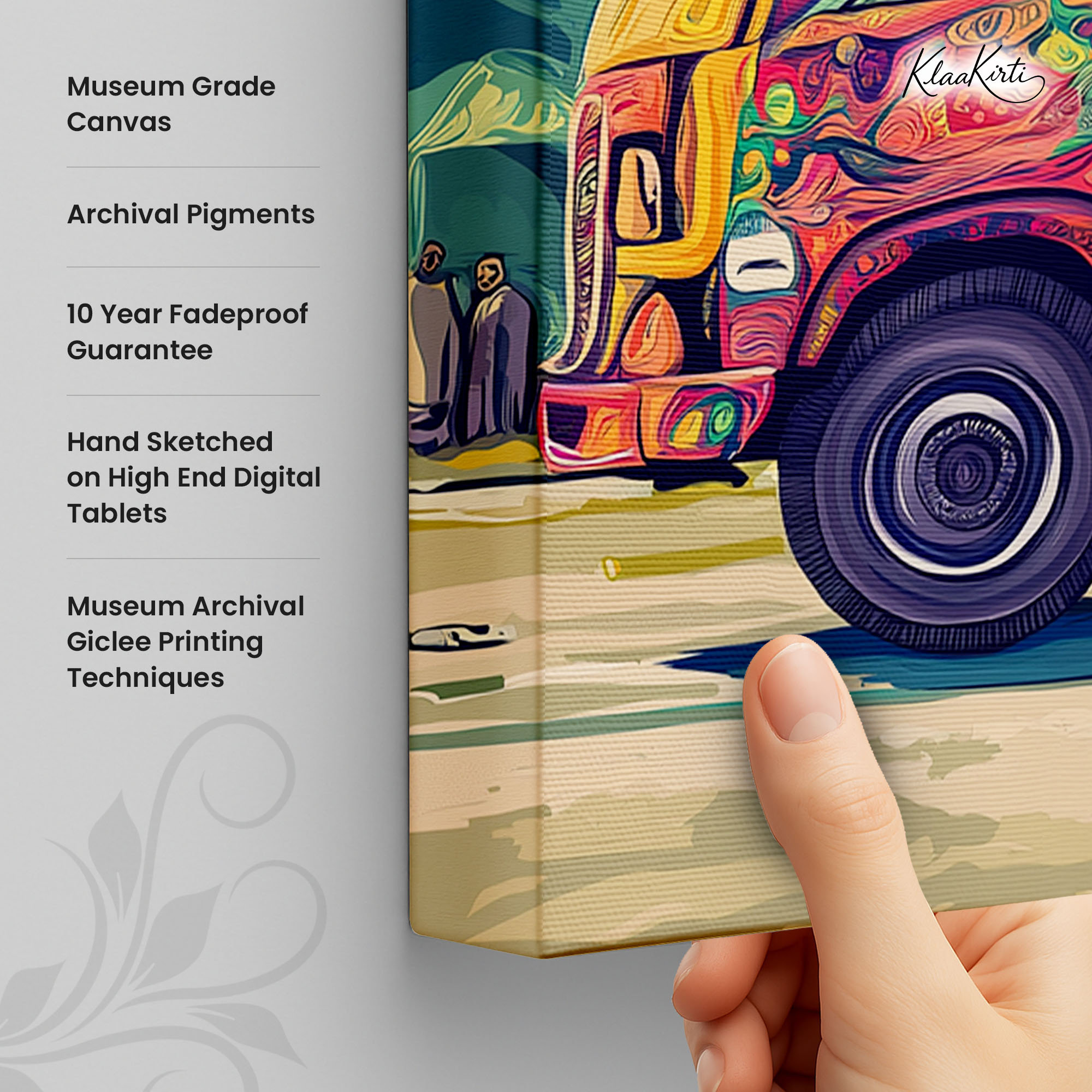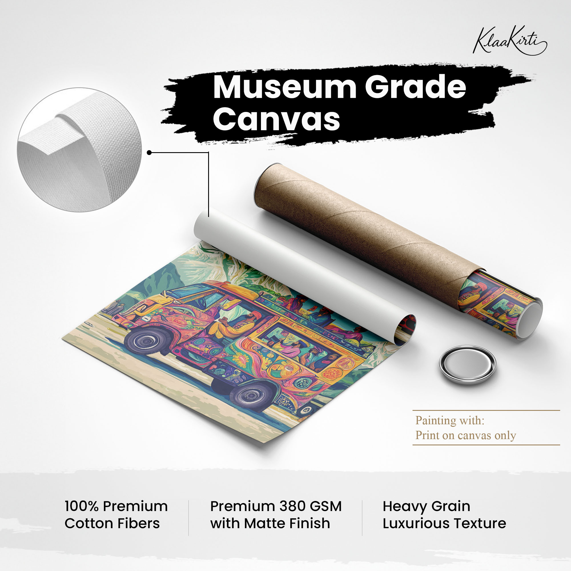 • Regular art prints can vary in quality depending on the materials and printing techniques used. At Klaakirti, our digital canvas prints are created using advanced printing technology and fade-resistant inks on premium, gallery-grade canvas. This ensures sharp detail, rich color, and long-lasting durability — giving you a piece that looks and feels truly premium.
