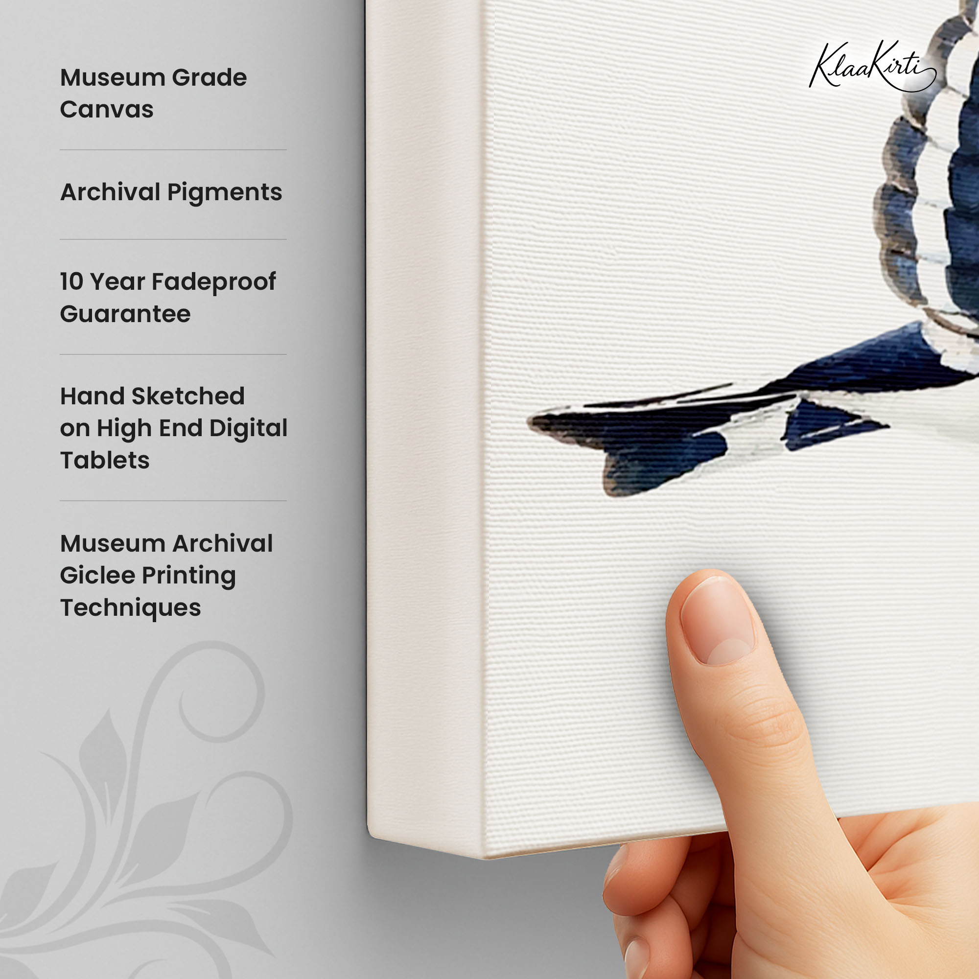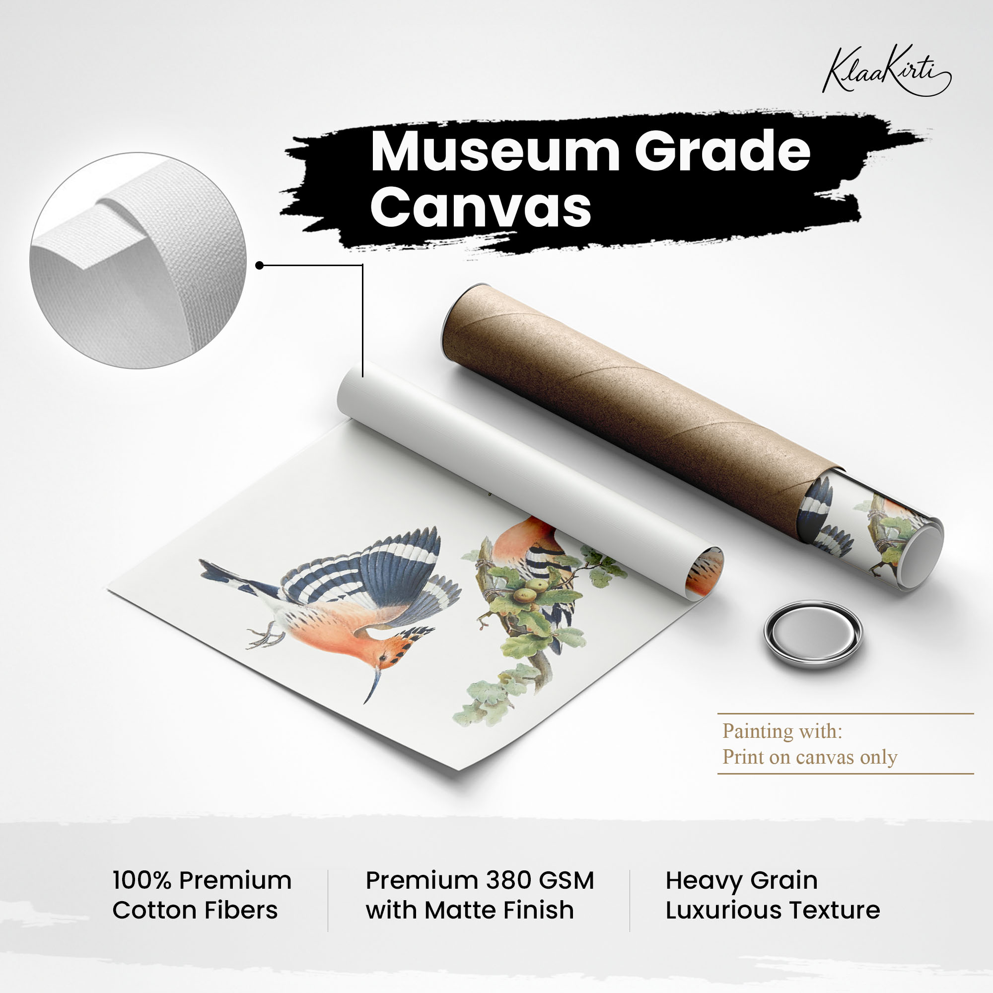 • Regular art prints can vary in quality depending on the materials and printing techniques used. At Klaakirti, our digital canvas prints are created using advanced printing technology and fade-resistant inks on premium, gallery-grade canvas. This ensures sharp detail, rich color, and long-lasting durability — giving you a piece that looks and feels truly premium.