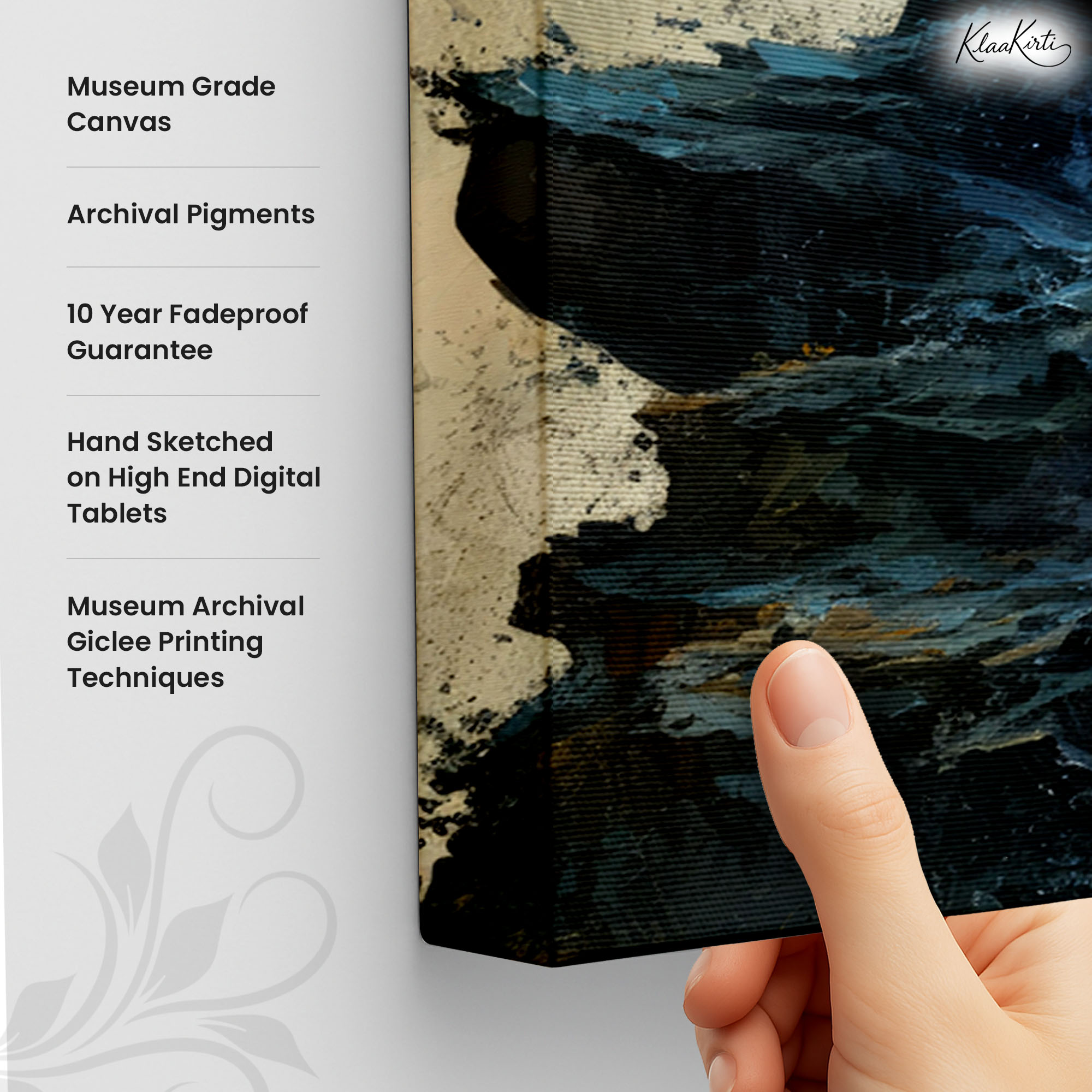 • Regular art prints can vary in quality depending on the materials and printing techniques used. At Klaakirti, our digital canvas prints are created using advanced printing technology and fade-resistant inks on premium, gallery-grade canvas. This ensures sharp detail, rich color, and long-lasting durability — giving you a piece that looks and feels truly premium.