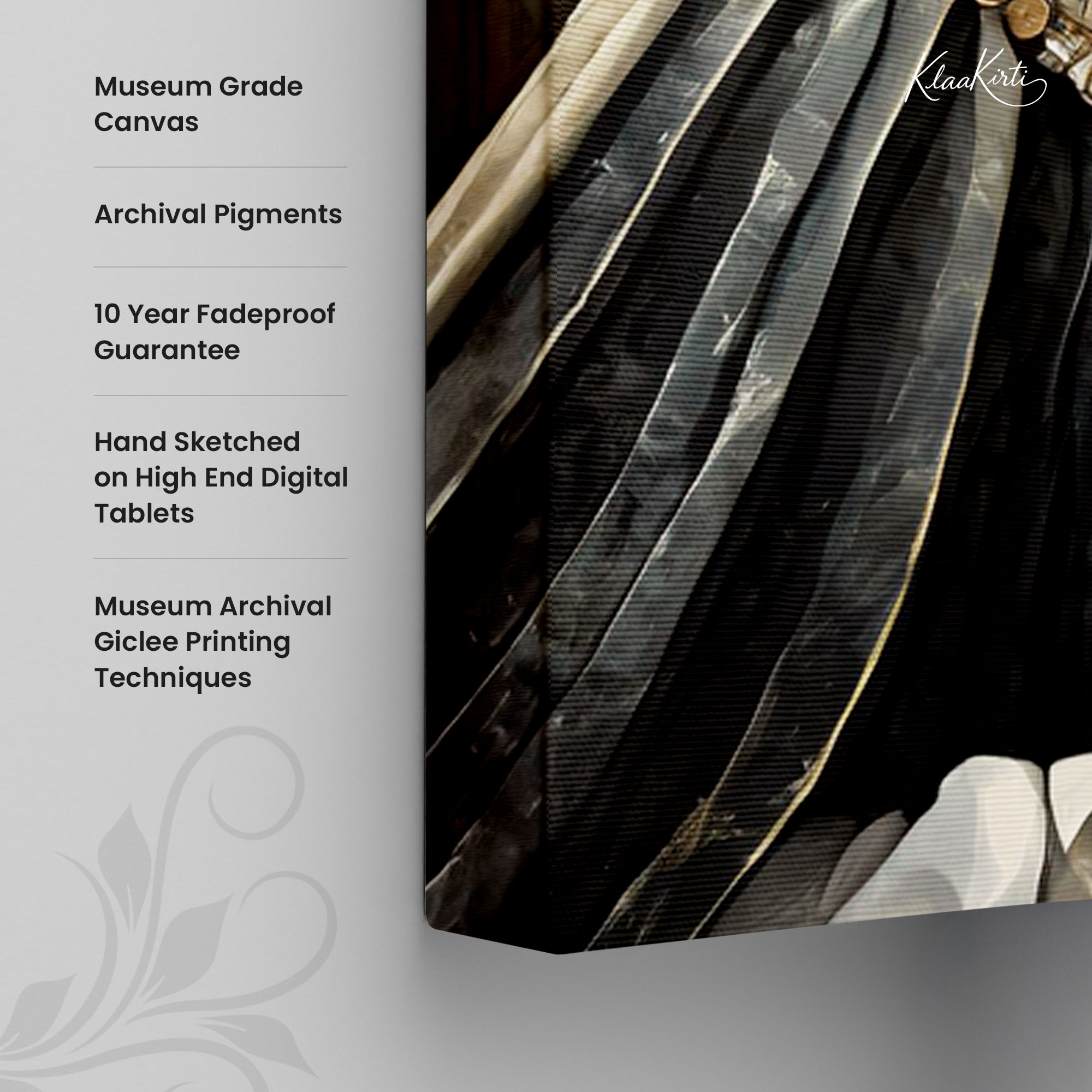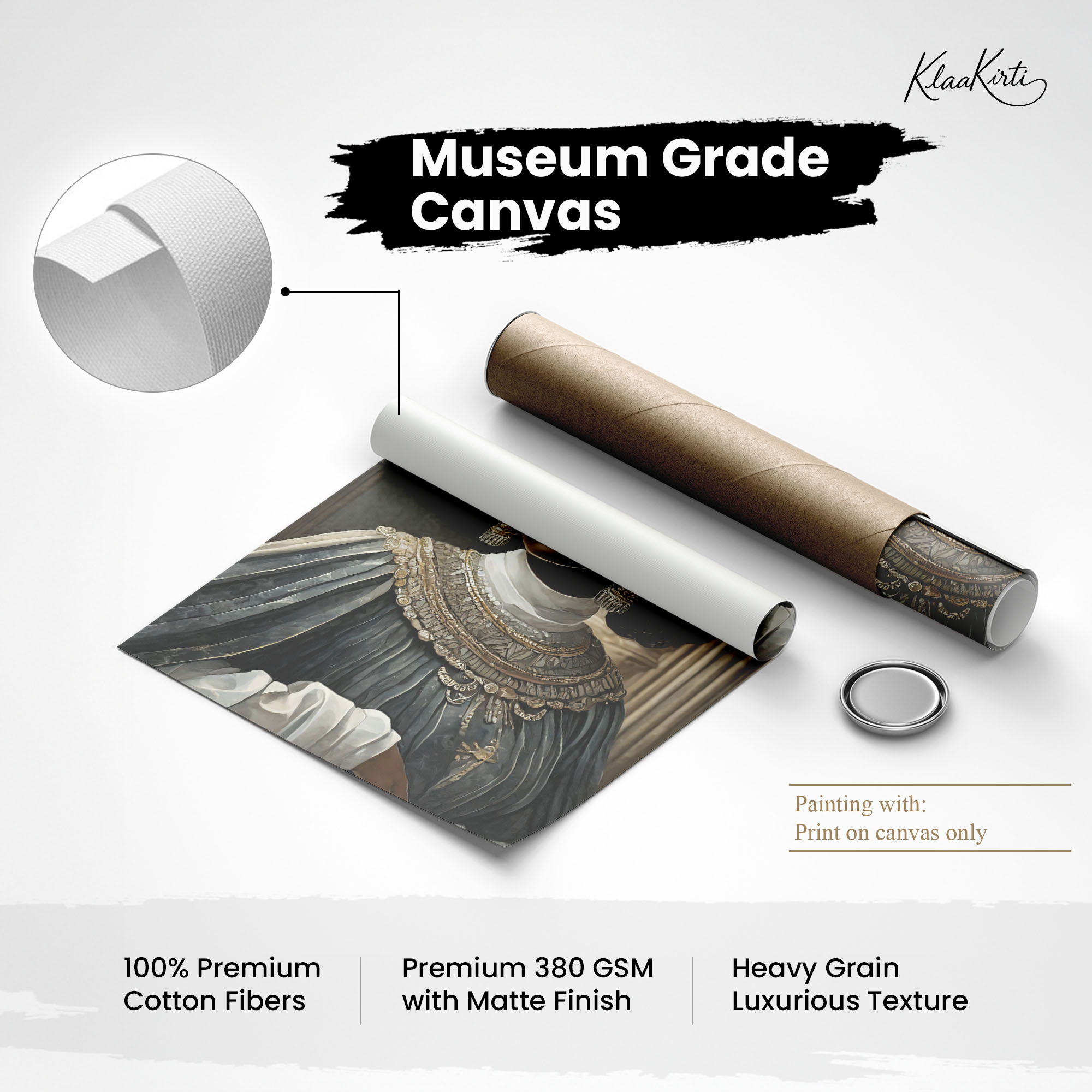 • Regular art prints can vary in quality depending on the materials and printing techniques used. At Klaakirti, our digital canvas prints are created using advanced printing technology and fade-resistant inks on premium, gallery-grade canvas. This ensures sharp detail, rich color, and long-lasting durability — giving you a piece that looks and feels truly premium.