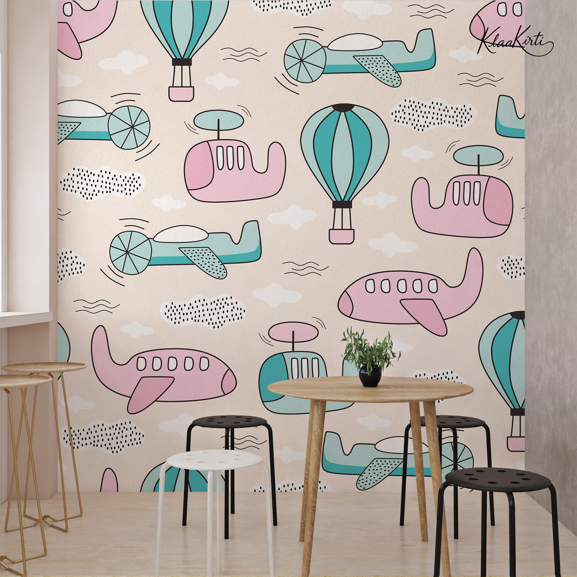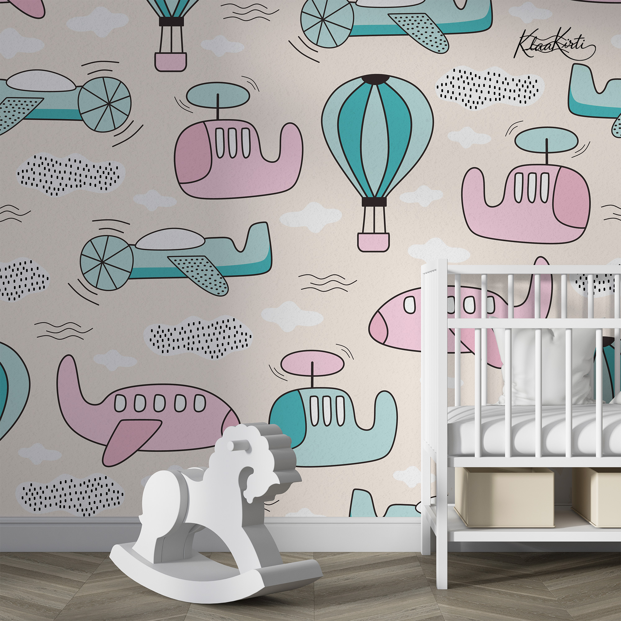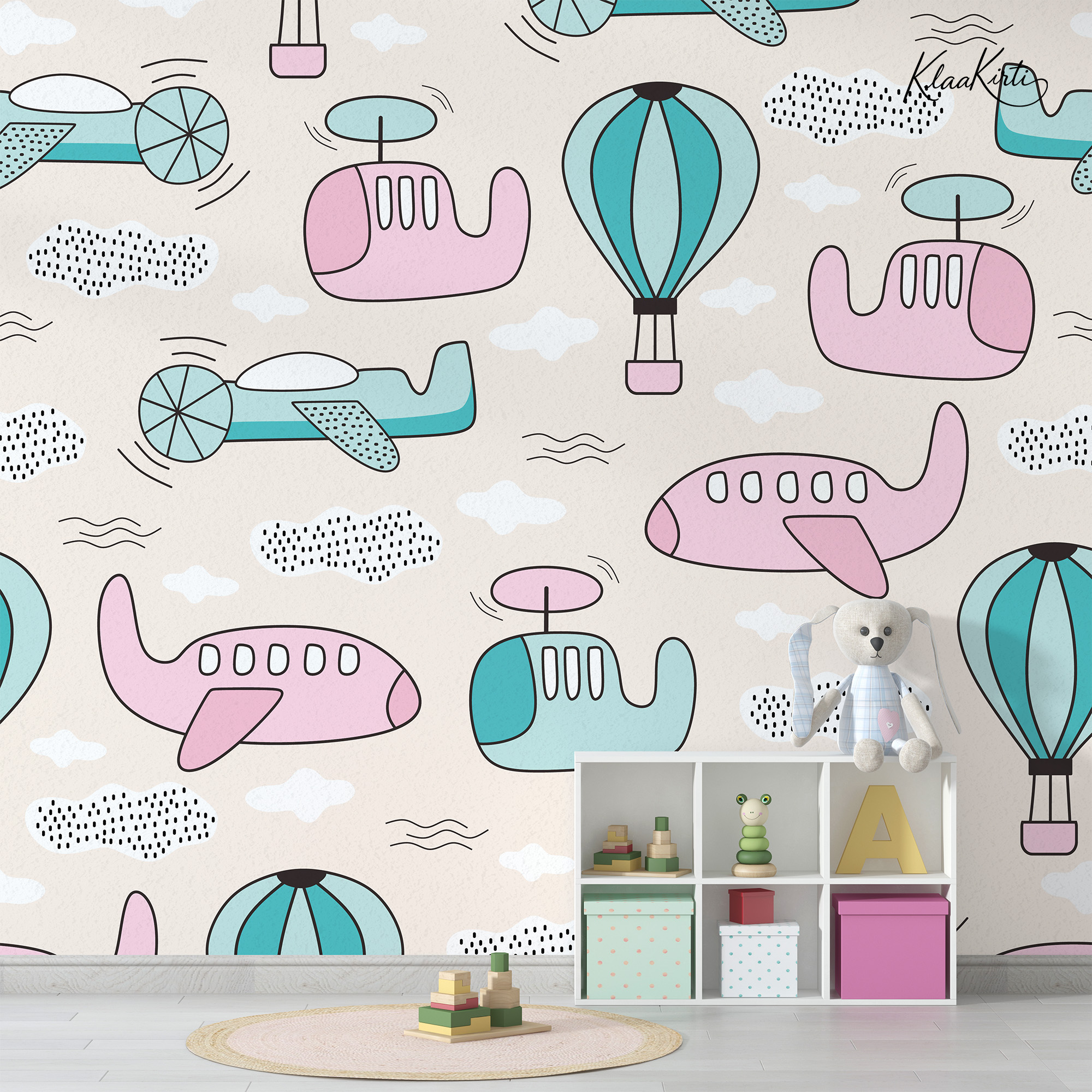 Elevate Your Walls with Pastel Planes and Hot Air Balloons Kids Premium Wallpaper