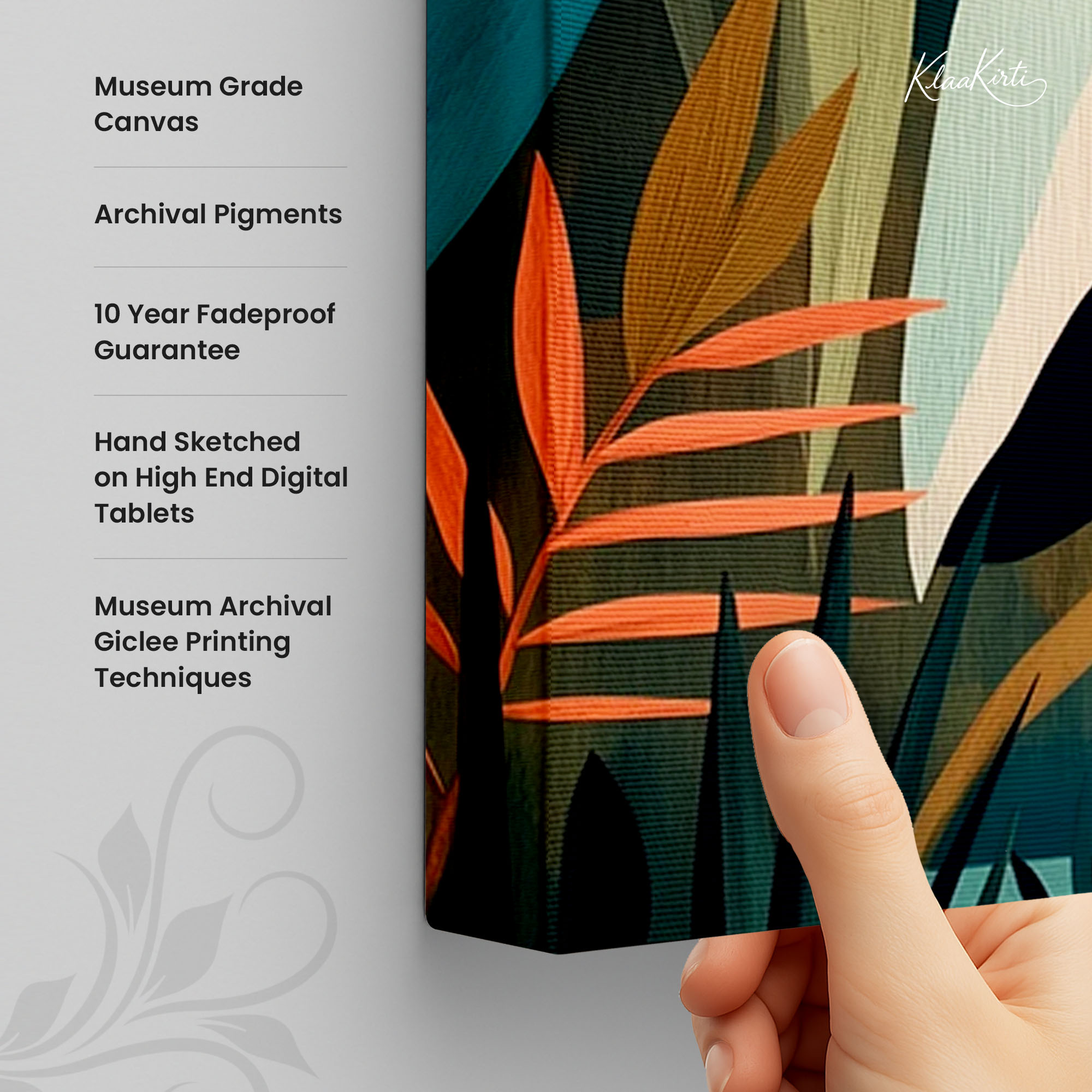 • Regular art prints can vary in quality depending on the materials and printing techniques used. At Klaakirti, our digital canvas prints are created using advanced printing technology and fade-resistant inks on premium, gallery-grade canvas. This ensures sharp detail, rich color, and long-lasting durability — giving you a piece that looks and feels truly premium.