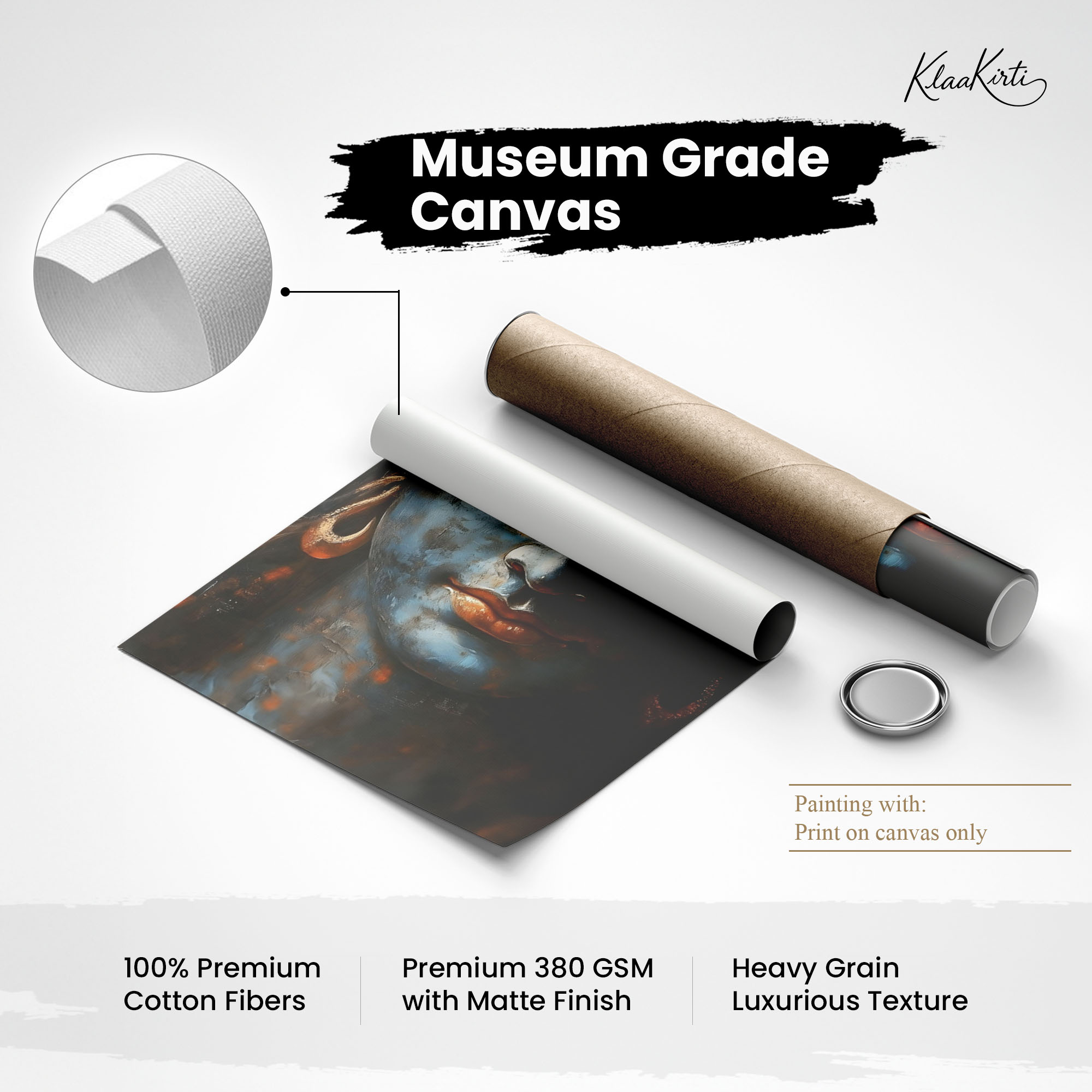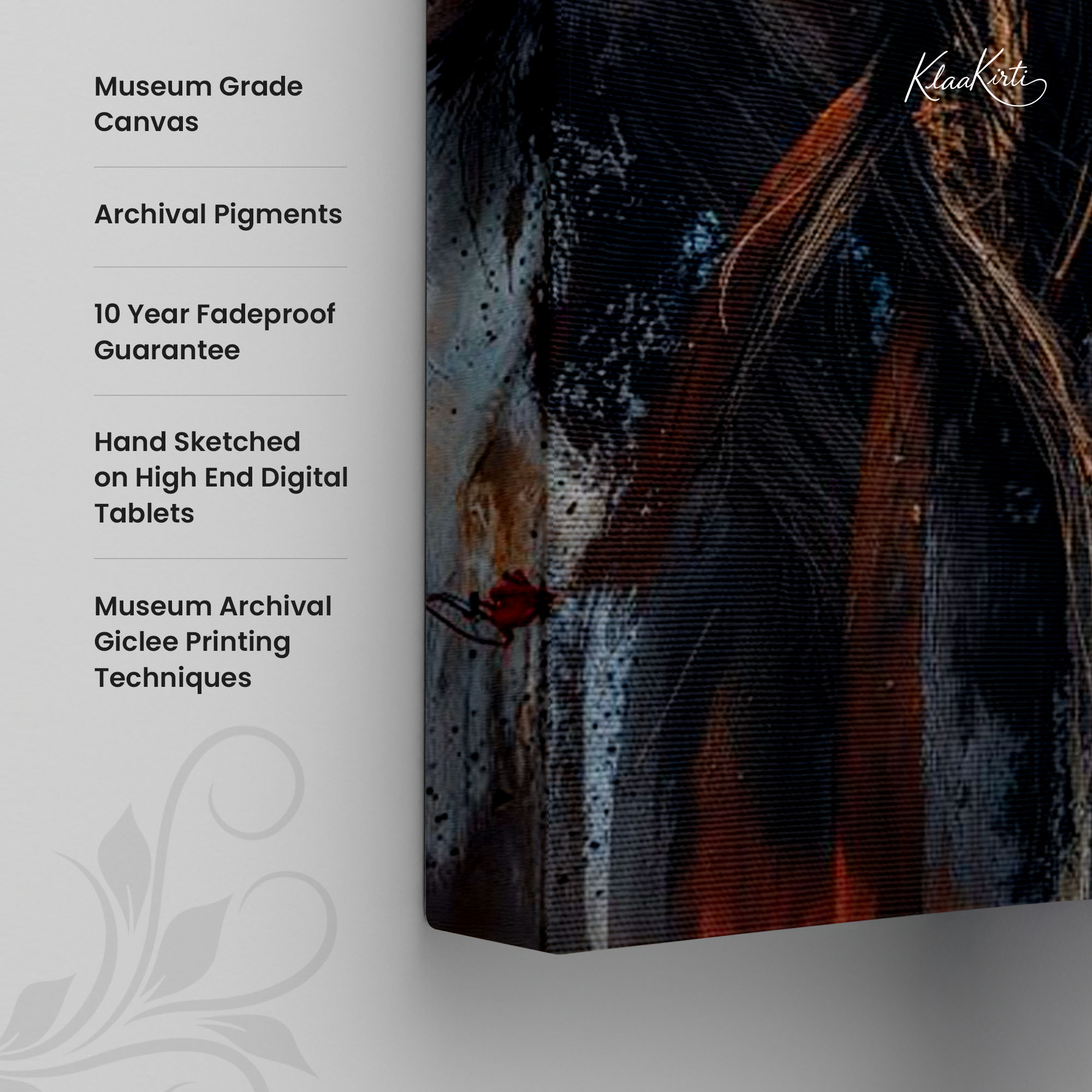 • Regular art prints can vary in quality depending on the materials and printing techniques used. At Klaakirti, our digital canvas prints are created using advanced printing technology and fade-resistant inks on premium, gallery-grade canvas. This ensures sharp detail, rich color, and long-lasting durability — giving you a piece that looks and feels truly premium.