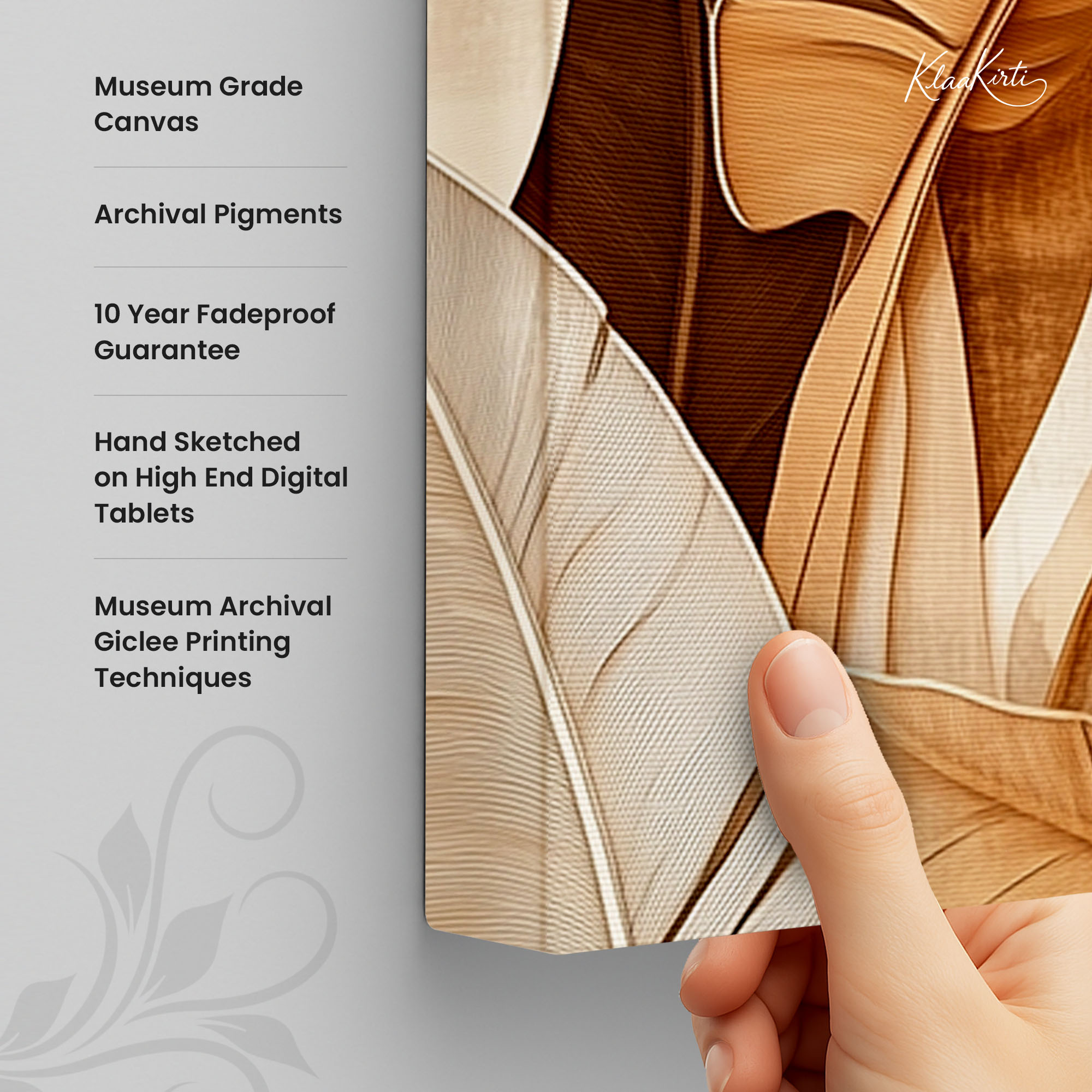 • Regular art prints can vary in quality depending on the materials and printing techniques used. At Klaakirti, our digital canvas prints are created using advanced printing technology and fade-resistant inks on premium, gallery-grade canvas. This ensures sharp detail, rich color, and long-lasting durability — giving you a piece that looks and feels truly premium.