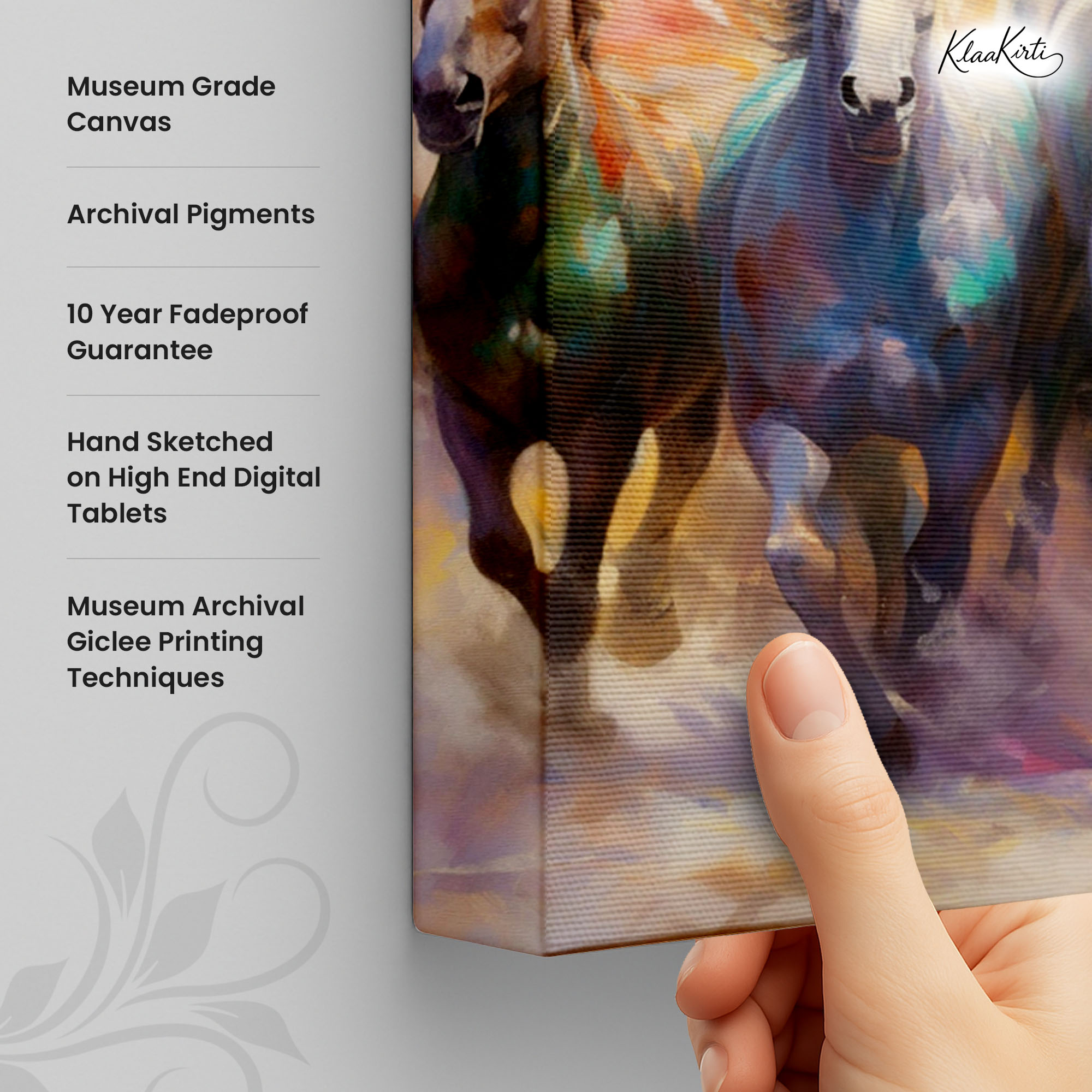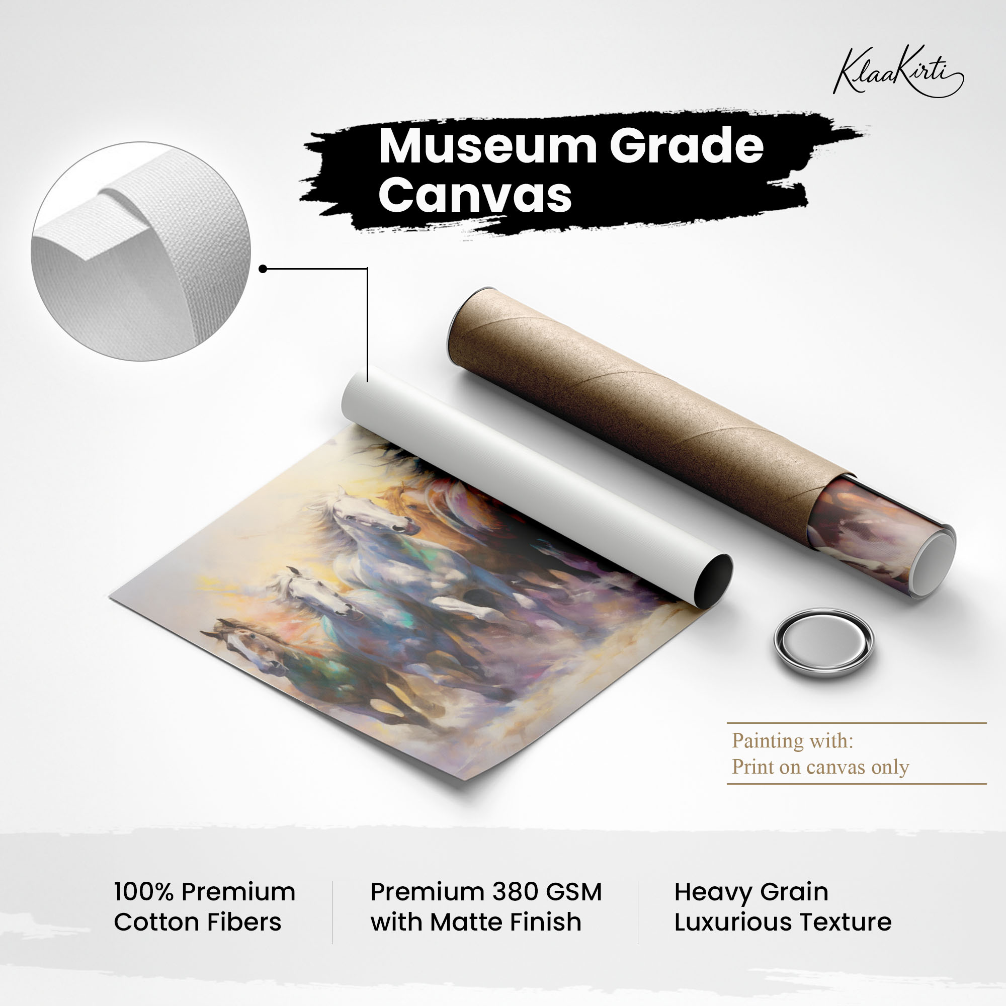 • Regular art prints can vary in quality depending on the materials and printing techniques used. At Klaakirti, our digital canvas prints are created using advanced printing technology and fade-resistant inks on premium, gallery-grade canvas. This ensures sharp detail, rich color, and long-lasting durability — giving you a piece that looks and feels truly premium.